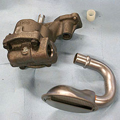 step 4. install new oil pump, i believe the torque spec is 35 or 50 ft-lb for the bolt, and pump shaft with new collar so it wont fall off. you should replace the oil pump shaft collar as they are only like 2 dollars and is "cheap insurance". its the little white thing in the upper right hand portion of the picture.