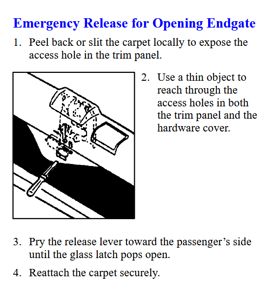 Believe it or not, this is the emergency release procedure from the owner's manual on my 02: