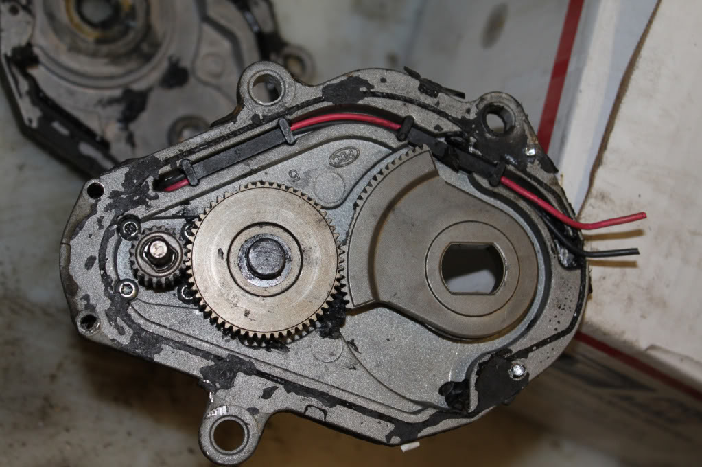 If you find that the transfer case moves well between detents, then the encoder motor may be the problem. If you are careful enough, you could pull the encoder apart and have a look at the gears inside. The attached picture shows the internal gearing of the NV233 encoder motor, specifically a failed unit where the final drive sprocket has stripped teeth from either a manufacturing defect or an issue with a shift that sheared the teeth.