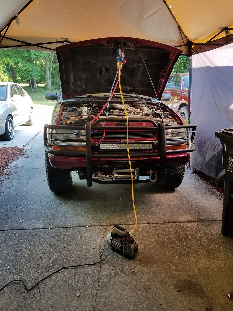 (now I've got to restock my "warehouse" lol). I'm literally typing this up on the shop computer while I wait on the vac test. That's right. I borrowed a buddy's vacuum pump, and by golly I'm doing it right this time gosh darnit lol.Got about another 10 minutes to go, so far it's holding vacuum strong, and then I'm going to run the pump for 45-60 minutes while I eat dinner, then come back out and charge the system with freon and see if I can get some cold air!