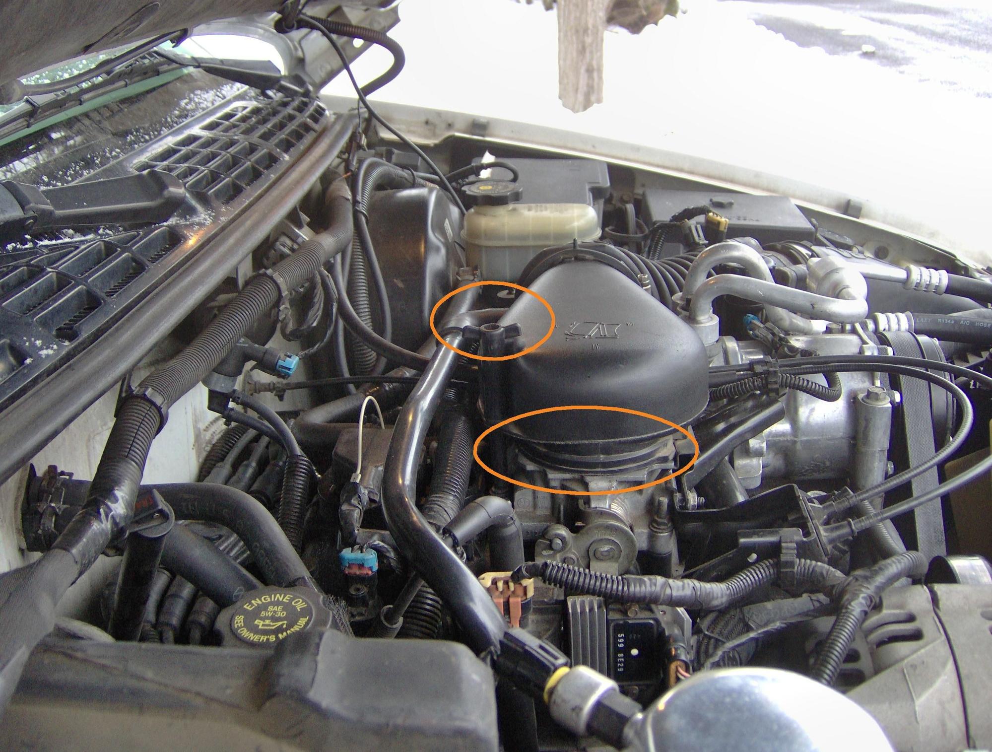 On the 2nd gen Blazers, the air supply duct has a connection on the back side of it facing the firewall that connects to a long hose/tube that goes to the passenger side valve cover. Make sure that hasn't come off.