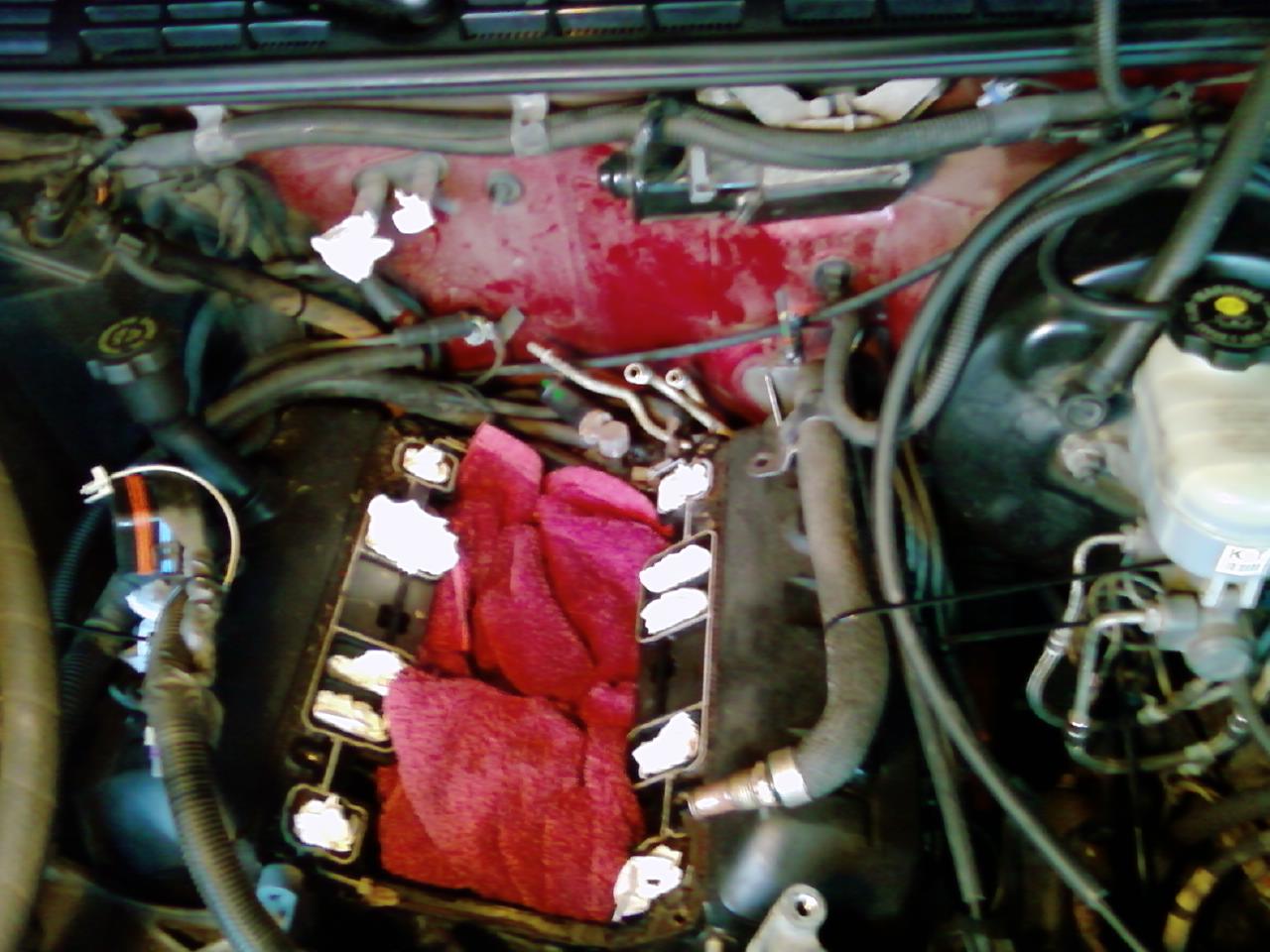 OK, I got the intake manifold off finally so I'm happy about that but I'm bummed about the broken fitting on the cruise control cable(see original post with pictures). I'm still curious if anyone has encountered this repair before. Disregard the question on the wiring harness. Tomorrow I have to find a torque wrench which reads in inch-pounds. Not sure what to look for so any input would be helpful. Also, need to get the felpro gaskets(NAPA?). Do I need a tap in order to clean the bolt holes sufficiently? Also looking for recommendations on adhesive material for front & rear of engine surface. Wondering if I should change the valve cover gaskets since I'm this far into it. The covers move (slightly) with some tugging. Here's a couple of pics with the the manifold off.