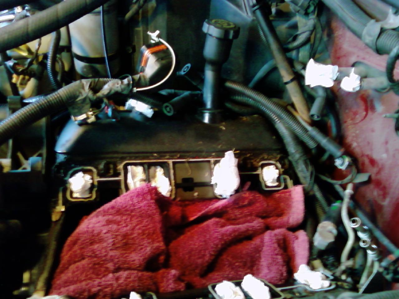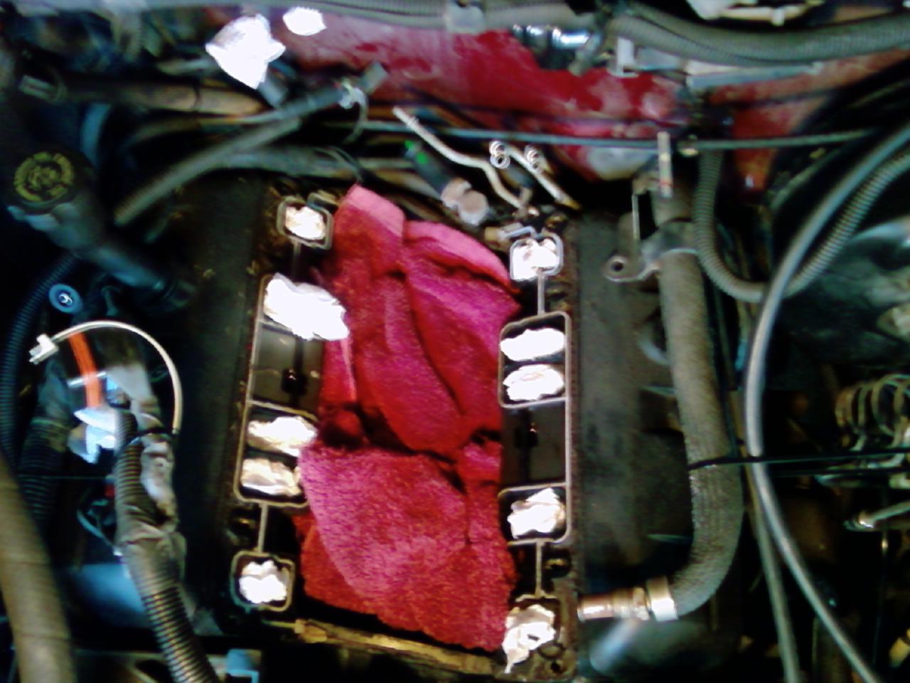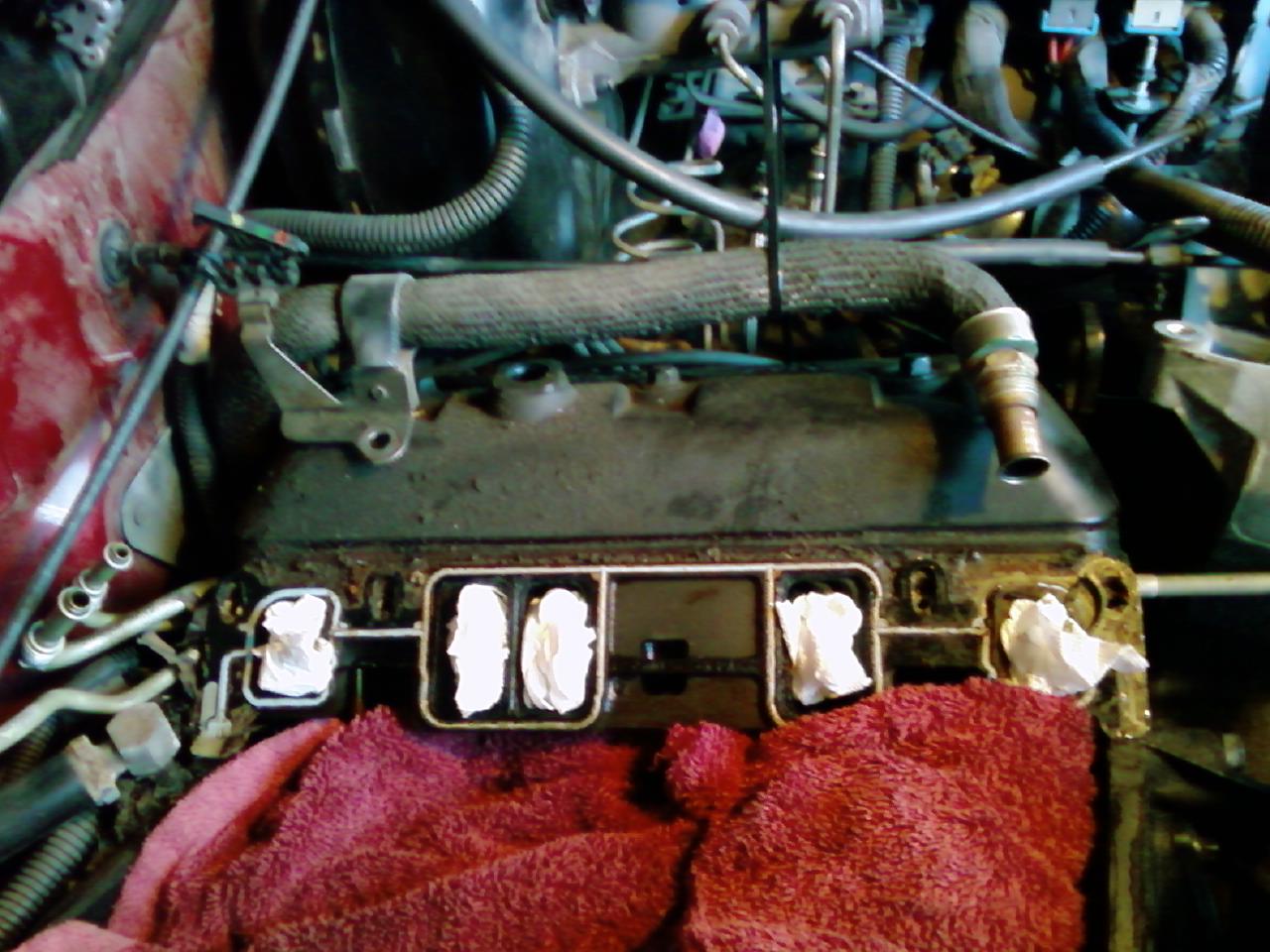 O.K. I've got the surfaces of the intake and engine cleaned up real good and was wondering if I should replace the valve cover gaskets also since they were included in the felpro gasket kit. Here's a picture. I cleaned the valve covers off some and can't tell if the gaskets are leaking.