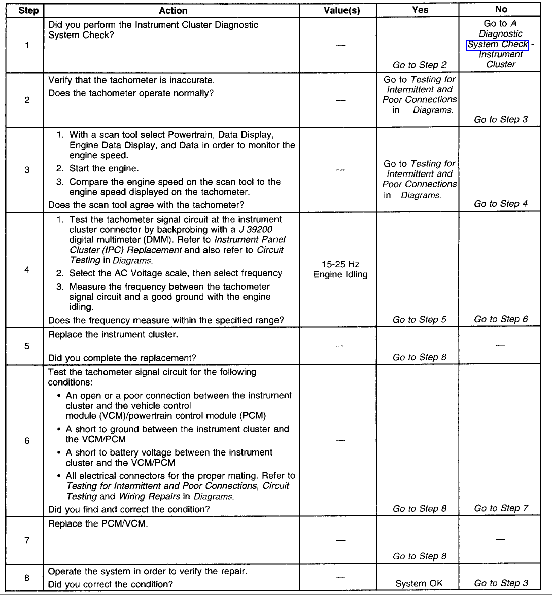 Another method of diagnosis would involve a high feature scan tool which would be able to monitor the tach and speedo signals from the PCM for signs of the discrepancy. If it is messed up coming from the PCM, then the problem lies elsewhere. If it is not, then there is something wrong with either the communication between the cluster and the PCM or a problem in the cluster itself.