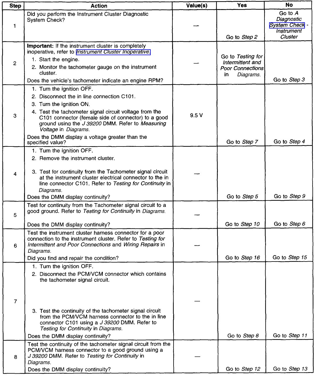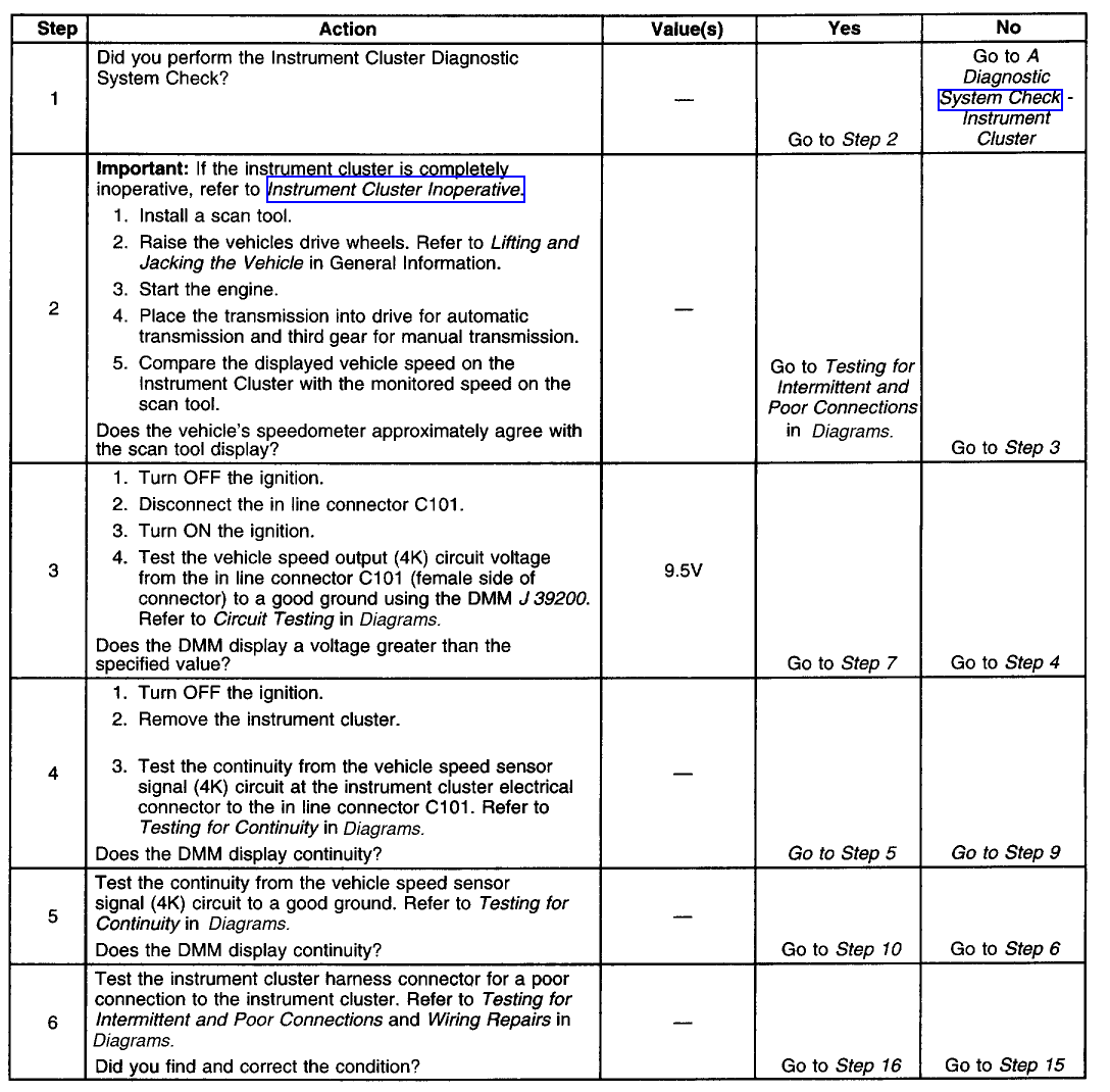 Below you will find some of the diagnostic charts regarding the tach and speedo. I am not sure if they will really help you much, especially if they require a bi-directional scan tool for some of the diagnostic steps, but they may offer some insight as to what might be causing both of these problems. I guess just look for some similarities.