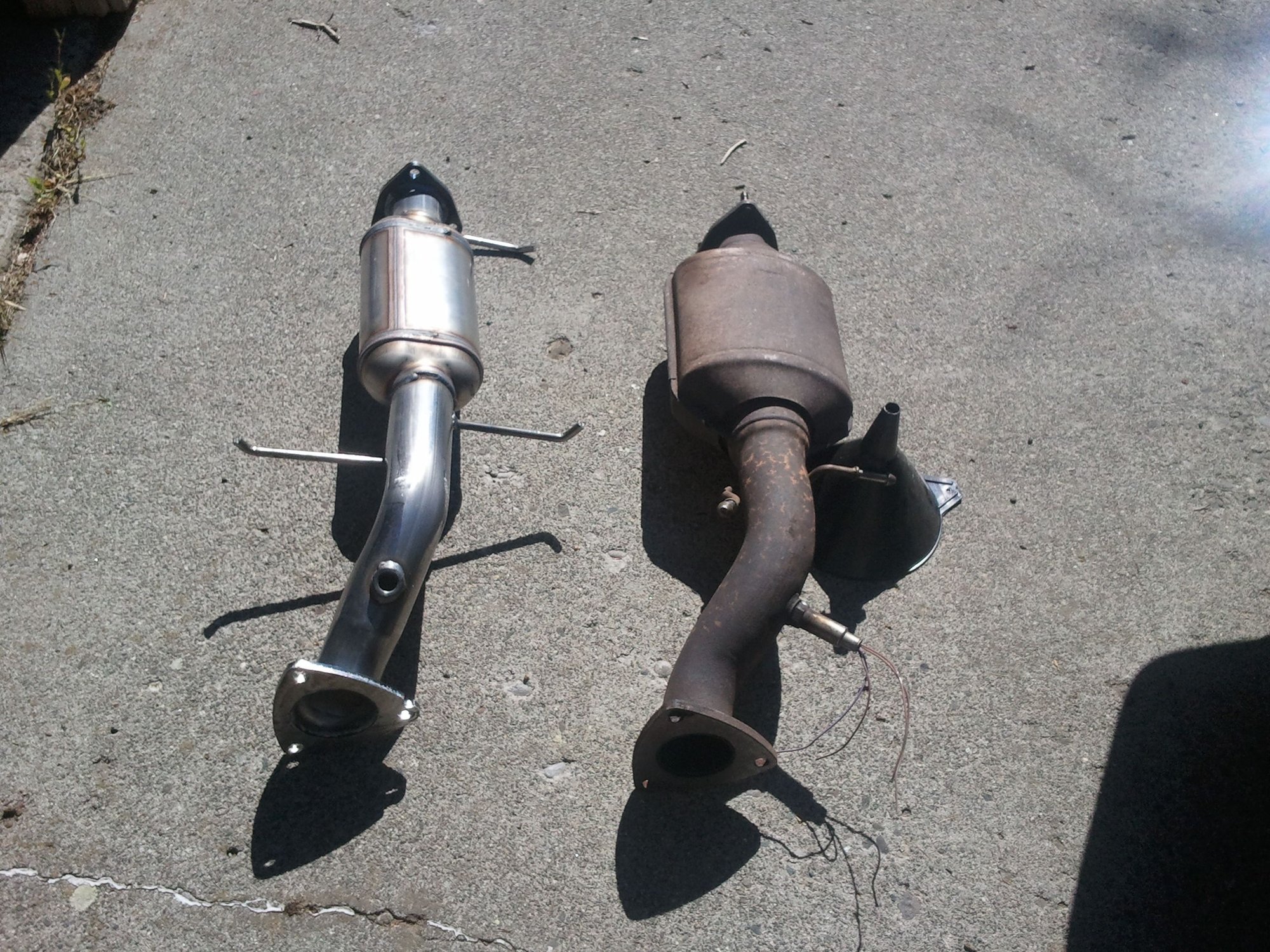 Underside of cats; new on left, old on right. Note how the O2 sensor needs to come out of the pipe to the side.