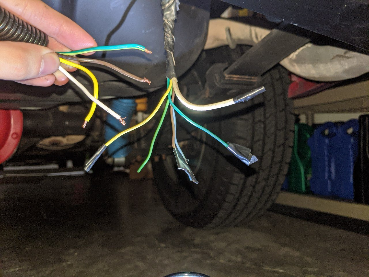 In the below photo, I twisted the corresponding wires together (trailer harness on the left; vehicle harness on the right)
