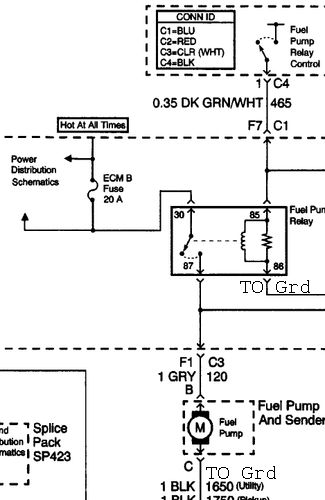 Ohmmed out pin 87 to GRD. No continuity.. meaning FP not getting power or grd, open circuit somewhere.