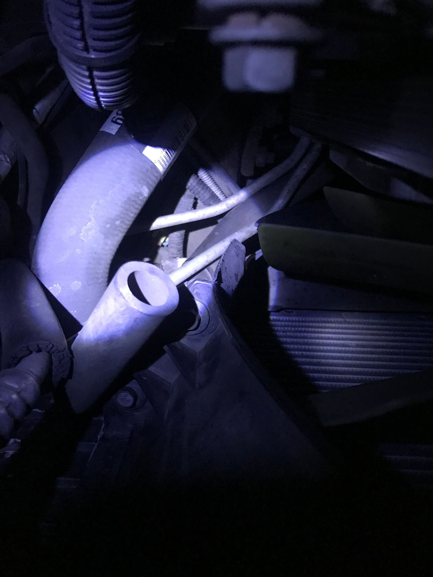 Hose pointing upwards is near the radiator fan (passenger side), but not sure what it is for. Please share any ideas. Thanks!