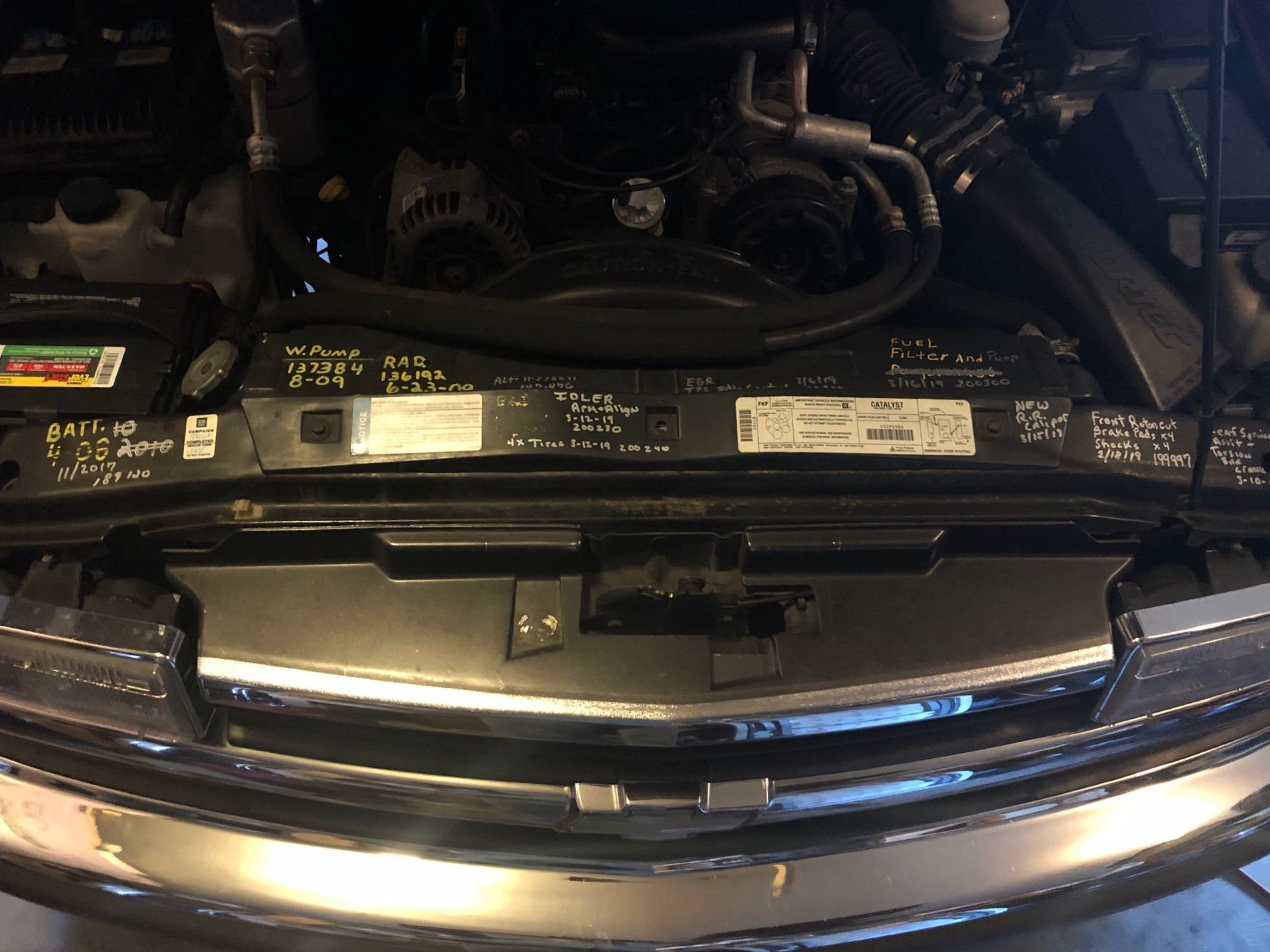 Prior owner made notes of repairs under hood with paint marker pen, I liked the idea so continued doing it, my notes are in silver.