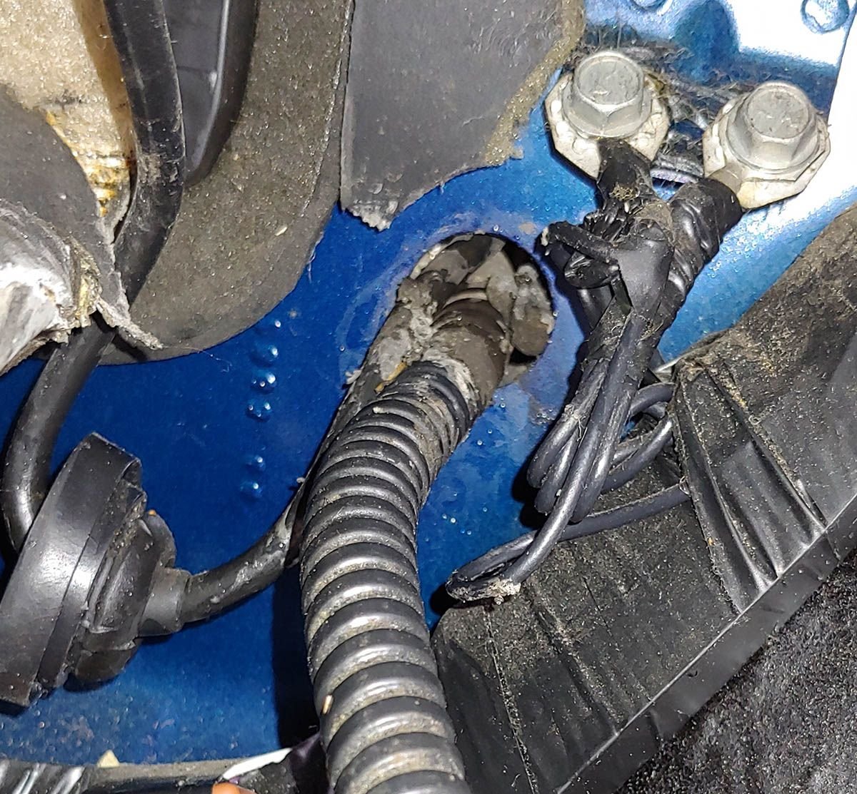 This is usually done by the dealer and some does it properly and some does it poorly like in this case. They had used some rubber sealer to form a filler but it had fallen out of the hole and when it rains it pours in some and end up on the floor under the mat. It's kind of easy to fix, I just have to reapply some new and better sealing compound there and make sure that it is properly sealing.