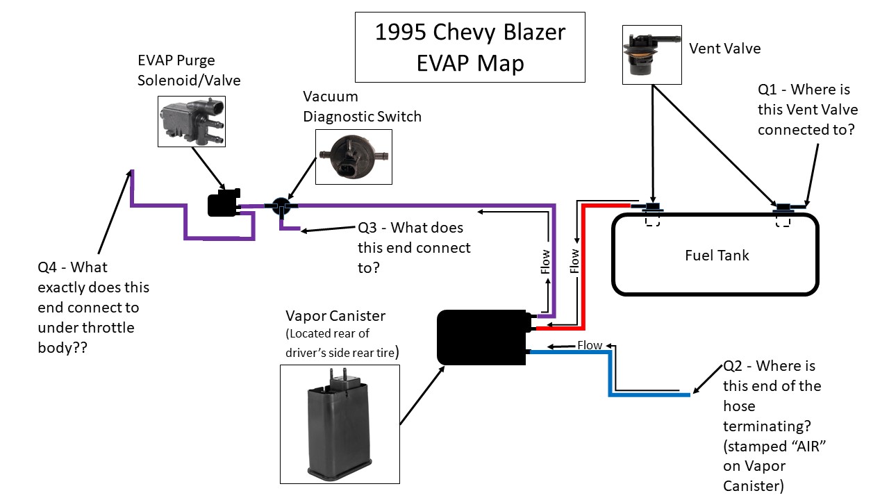 Red, I put together an incomplete EVAP map/diagram for your Blazer as I understand it to this point (see pdf attachment). If you can answer the questions on the map for me I can do a better job that might not only help you but someone else in the future. Some comments: