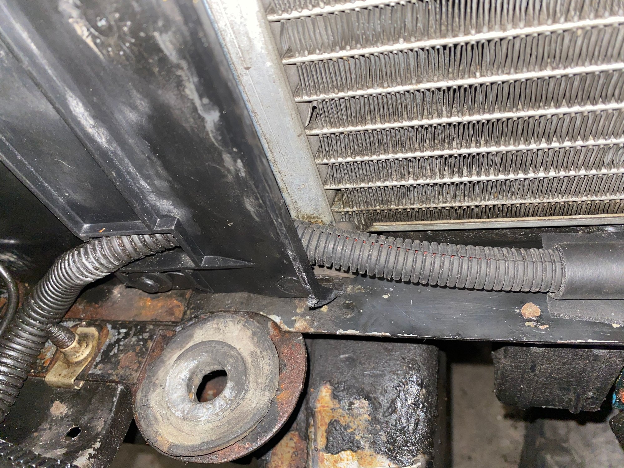 I used an old 1/2 extension and a 4lb sledge to indent the factory indention deeper on the side that meets the front lower plastic of the 3 piece fan shroud. Took a half dozen plus hits. Worked nicely though. You’ll also notice hvac foam tape used to secure wire on top of the core support without drilling any holes causing a rust issue. Product holds up to oil pretty well in hvac lines and sticking to the refrigerant lines so I felt it was a good option. Not worried if it fails down the road really as radiator will be in place.