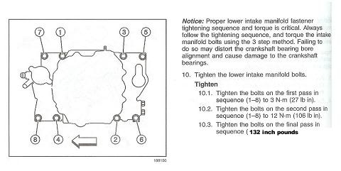 When installing the lower intake, make sure you follow the tightening sequence and torque specs. If it is not done correctly, it can do permanent damage to the engine: