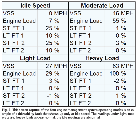 In the example above thje fuel trims are large and positive at idle so the system is adding fuel to correct for a lean condition but the problem goes away at higher rpms. A likely cause for this is a vacuum leak which is a lower percentage of total air flow at higher loads/rpms.