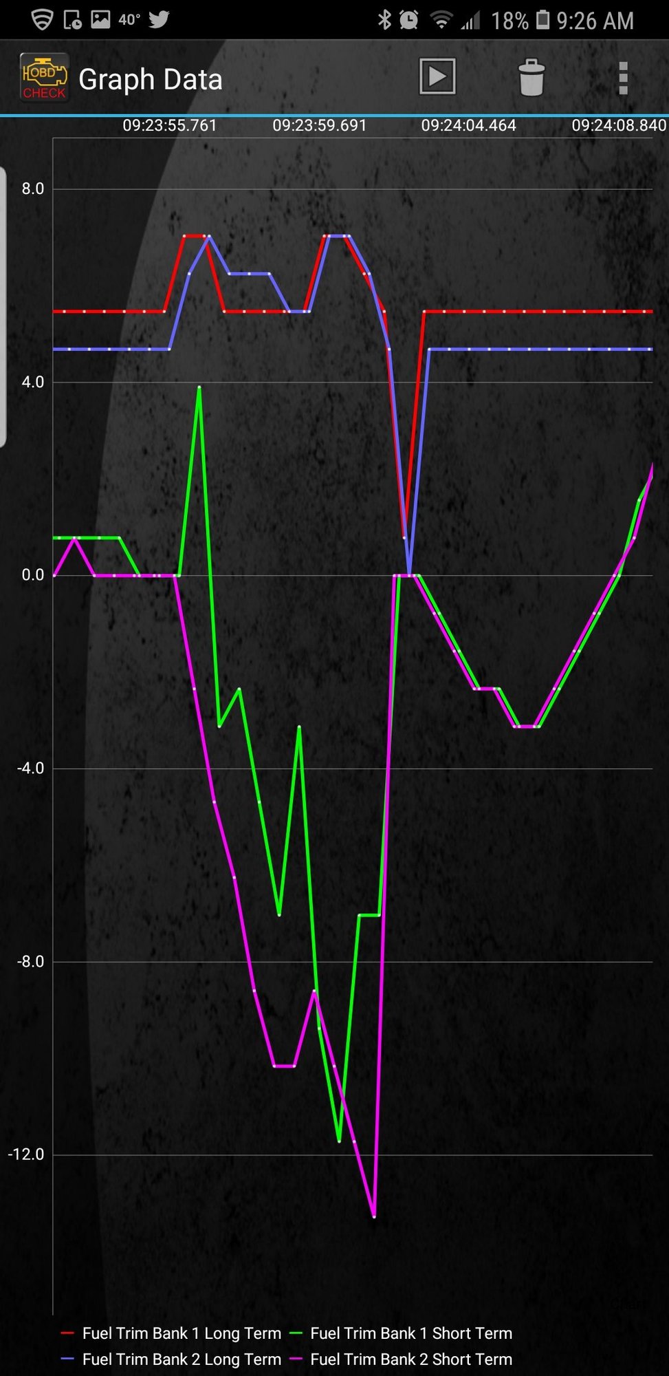 I have never looked at fuel trims as a time graph. I look at fuel trims as tabular data, and there there may be some smoothing. You take the short term and long term fuel trims and add them together. a negative number means the system is subtracting fuel via shorter injector pulses to correct for a rich condition as determined by the O2 sensors. Totals over 10 need to be addressed. Totals over 25 set a code. I may be overreacting now that I see the time scale at the top measured in seconds. If you can get simple tabular data for all 4 numbers that would help. Also, long tern trims should not be changing that fast unless I just cant see the color codes and the fast moving lines are both short term numbers. Either way, I dont find these graphs very useful. attached is a screen shot of what you want