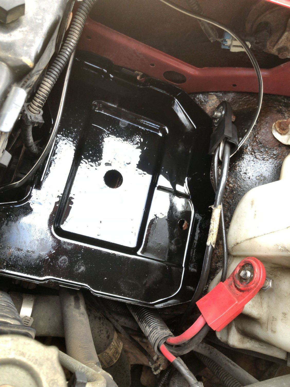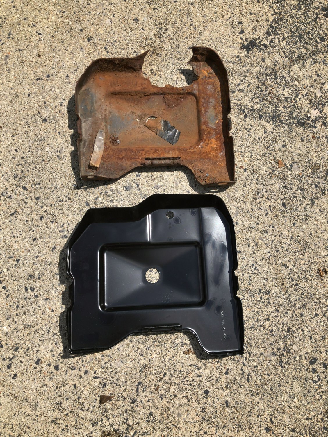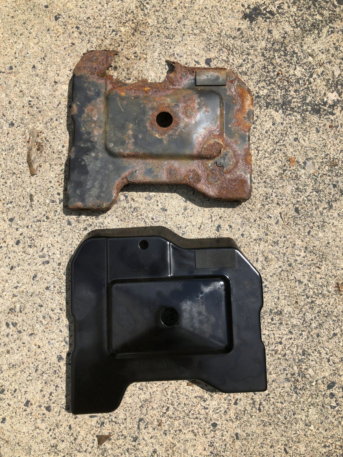 I wanted to post some pictures as an FYI as to why you never let your battery get that old and just let it leak. It had rusted so much the rubber piece could not be bolted down anymore. That’s what happens when you let your battery leak for a decade Where the bolt used to be, it completely rusted out It rusted right through the wheel well, I still wont be able to bolt it down properly The old one compared to the new one, top view The old one compared to the new one, bottom view The new one installed, I put a light coat of CLP on it to try and keep it from rusting.