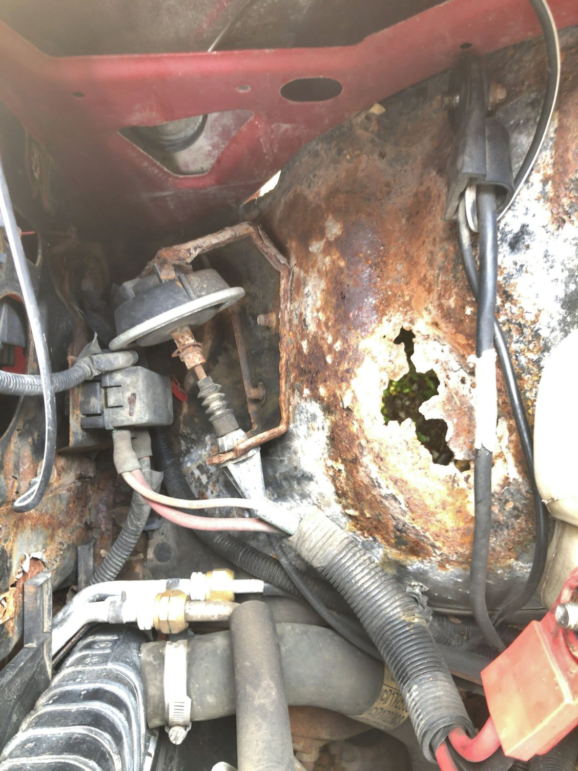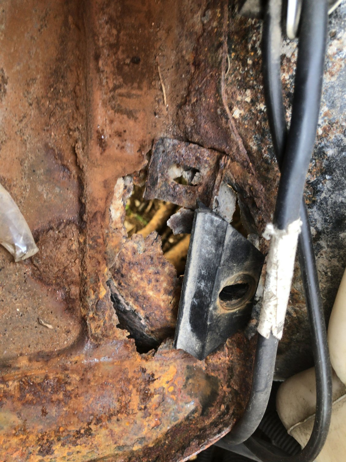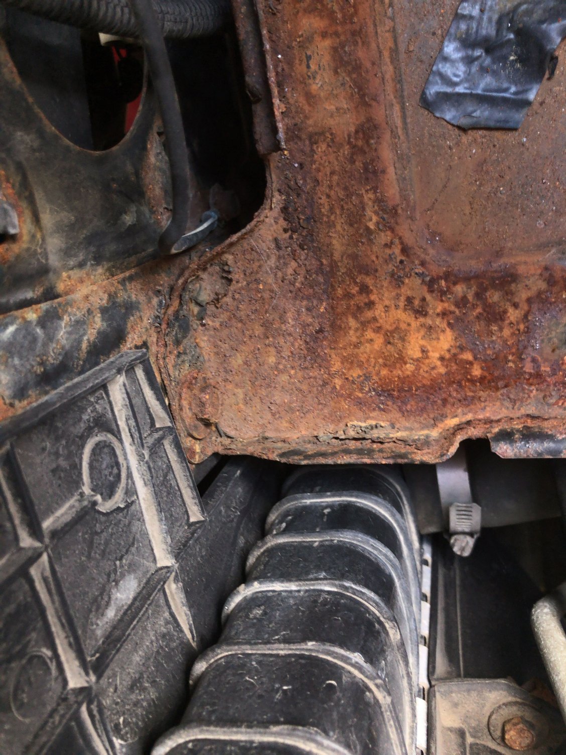 I wanted to post some pictures as an FYI as to why you never let your battery get that old and just let it leak. It had rusted so much the rubber piece could not be bolted down anymore. That’s what happens when you let your battery leak for a decade Where the bolt used to be, it completely rusted out It rusted right through the wheel well, I still wont be able to bolt it down properly The old one compared to the new one, top view The old one compared to the new one, bottom view The new one installed, I put a light coat of CLP on it to try and keep it from rusting.