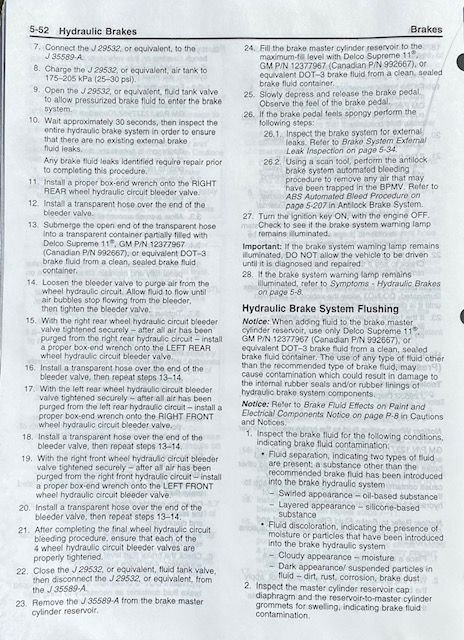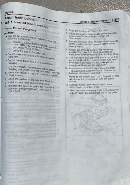Before attempting the automated bleed, all air MUST be bench bled from the master cylinder AND the steel flex lines going to the EBCM. The adage of "junk in, junk out" applies here. The automated bleed operates all of the solenoids in the EBCM. It draws fluid from the master cylinder, (and steel flex lines), and forces it into the steel lines exiting the EBCM. Each caliper must be bled to remove the air after doing the automated bleed. The automated bleed may need to be done several times. In the post above, refer to page 5-207, steps 10 through 13. One thing that is not clear in step 10, is that during the automated bleed, you must maintain constant pressure on the brake pedal. Once the scan tool confirms that the bleed is complete, then you can release brake pedal pressure.