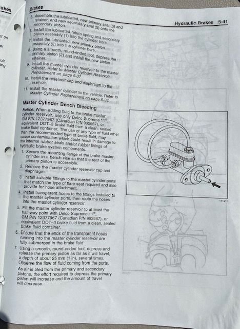 Watch the MC and have another person do some very short pedal presses, watch for air bubbles in the reservoir. Other than that, I have only had success with gravity bleeding my Blazer brakes...in the same order as you have listed above. Did a bleed of the MC again (while it was in the Bravada) this AM just to make sure there wasn't any air trapped in it. Short strokes, no air bubbles. |