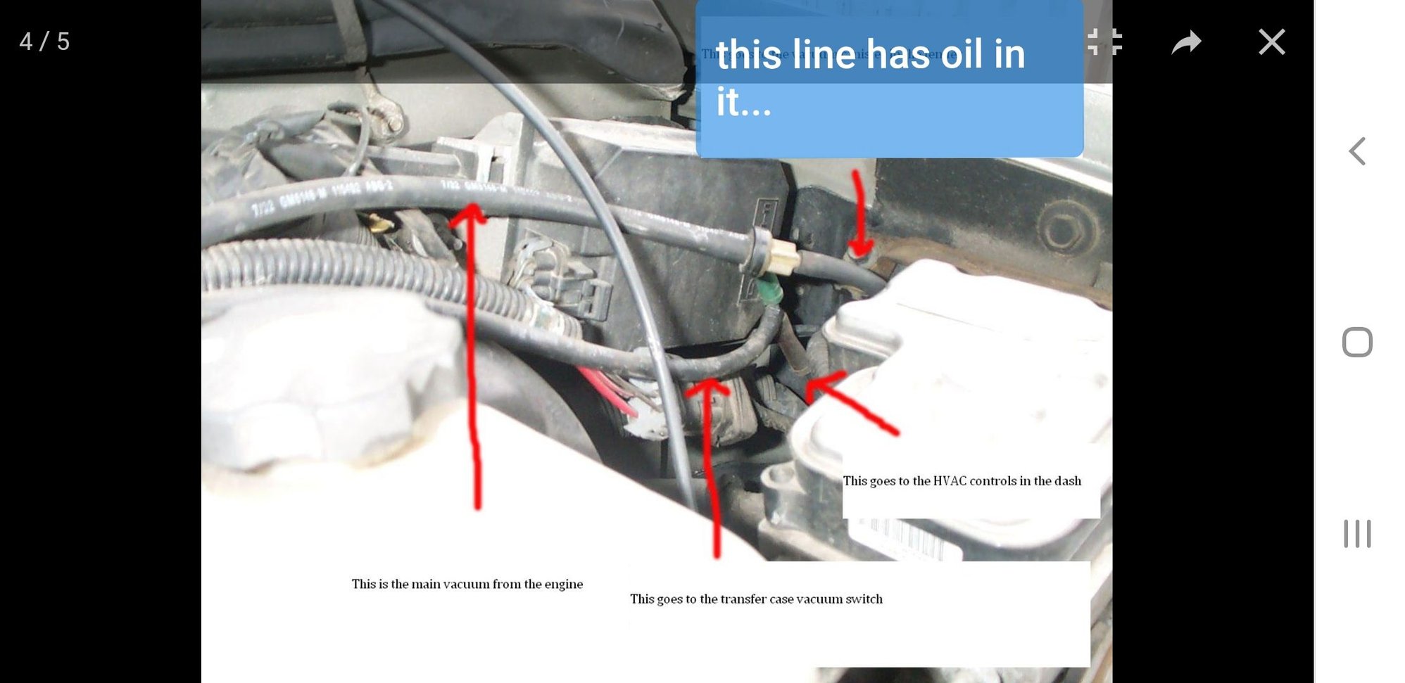 Now, I have had a few S10 trucks and 2 older blazers in the past, so I am no stranger to the issues with the vacuum system. The problem is that ive not had these kinds of issues before. Ive been dealing with the problems as my AC works and I'm getting air from my dash vents, but today after spending some time washing and detailing it, i noticed that the vacuum line that sits between the fender reservoir and the check valve is "sweating" oil. It feels like a scilicone hose when I handle it.