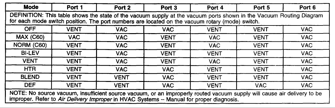I have been doing quite a bit of browsing and have made good headway in preparing to tackle HVAC under dash vacuum lines. I have a chart for the automatic system but I am having trouble finding a chart for the manual system. (Non RPO C68) Can anyone post one here? The image is for the auto system and looking for something similar to that so I know what is supposed to happen on each setting. My problem right now is heat/defrost is fussy and the slave unit and fresh air door are fussy. Just not sure what is supposed to open when. Thanks.