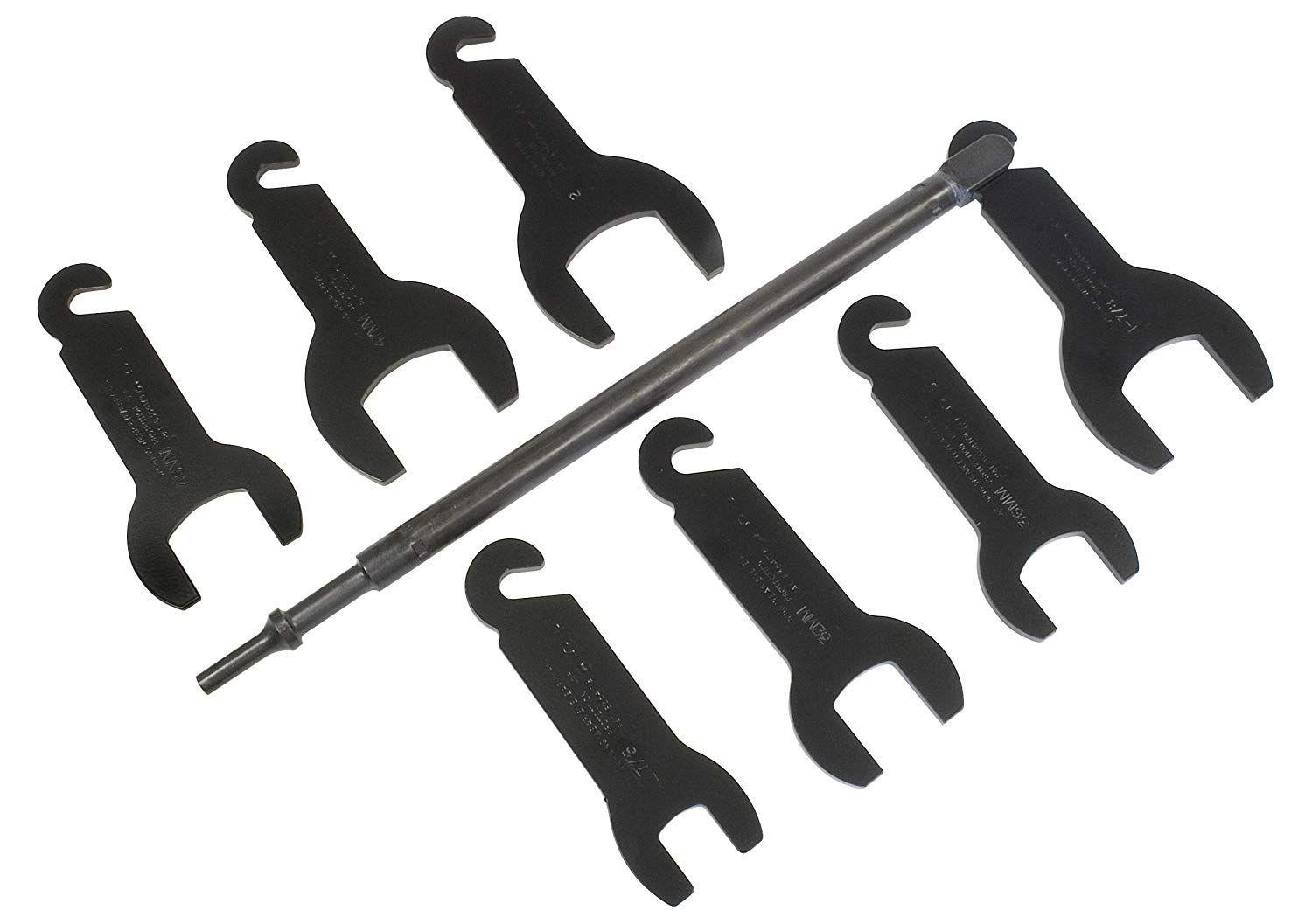 A air impact chisel with the punch attachment end inserted breaks the nut loose in seconds along with re tighting them