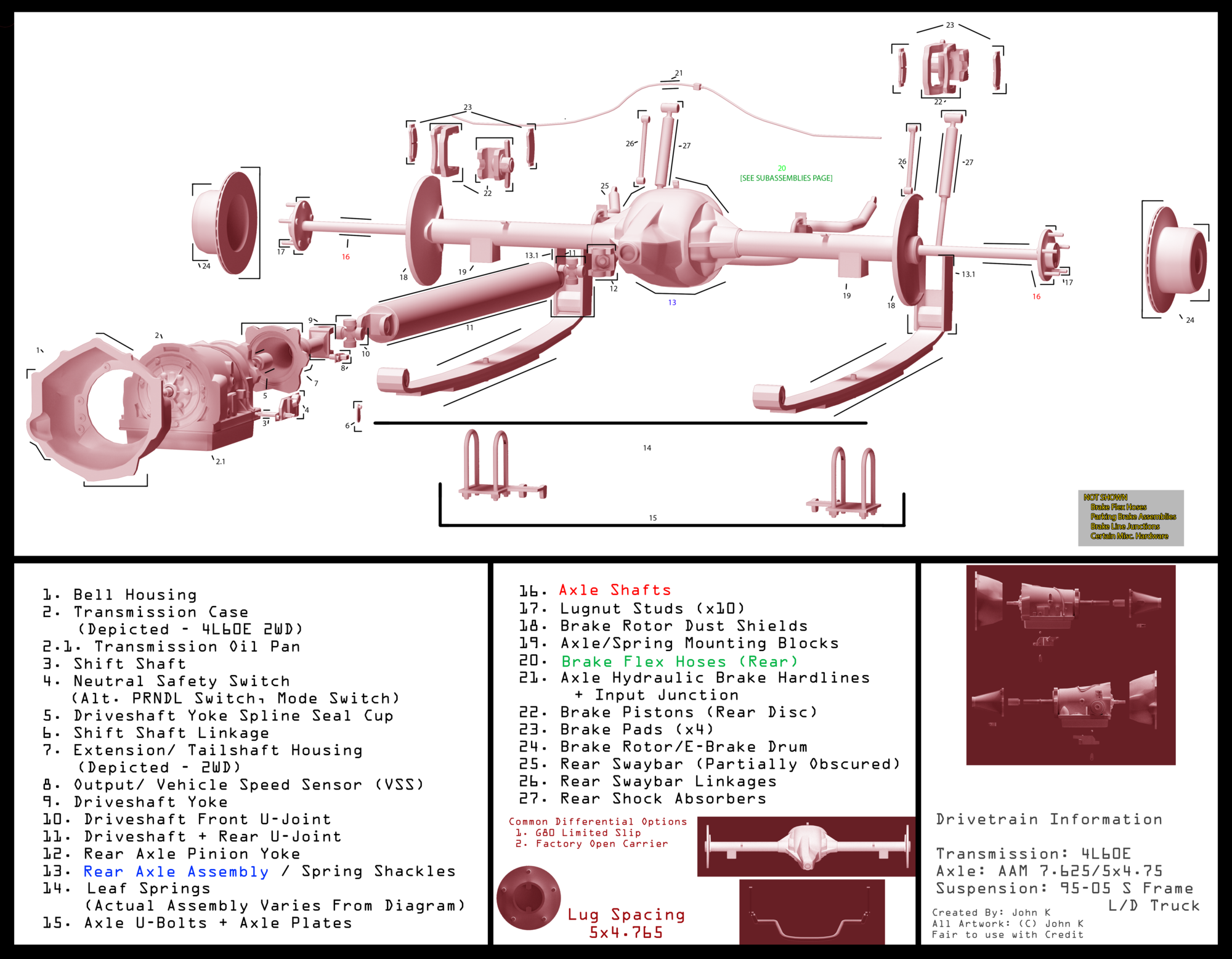 Good Morning, Something i've been bringing up alot is using modern CAD and 3D printing/design tools to keep our trucks on the road and looking nice and for informational purposes, I've put together a parts identification chart using 3D modeling software and photoshop, while most of us here probably know all of the stuff in this, we do get some people occasionally who have never worked on cars before, and i think its always good to have quality reference material on hand,with that i present 39 man hours of what happens when a Floridaman gets bored while stoned, i hope this is of some use. Original render for the artwork took 4 hours with 1114AA passes per frame.the image is very large and may take a while to load as its in 8k. Axle Subassemblies page will take a little while longer, will post in thread once I've finished it.