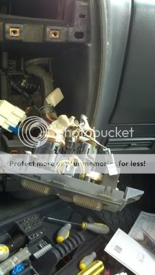Remove the bolts holding HVAC controls, head unit and lower pocket to the dashboard. They are all the same so you do not have to worry about putting them back in the same holes.