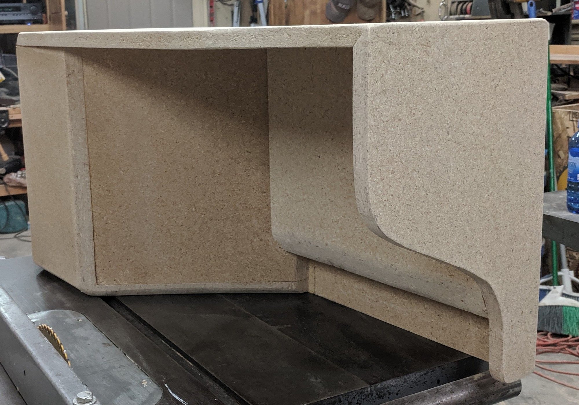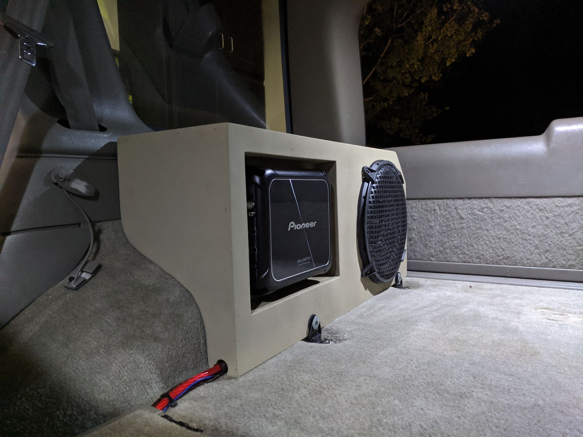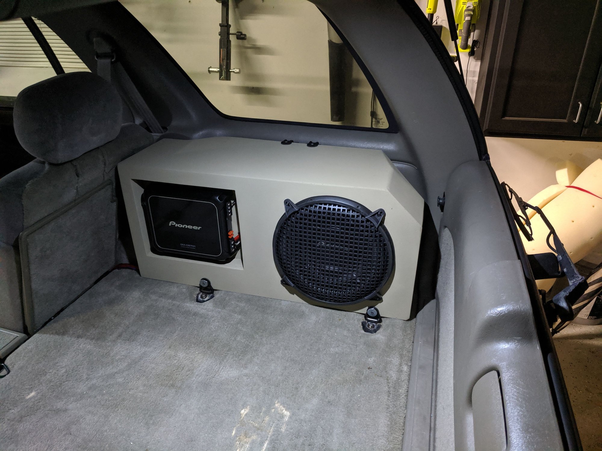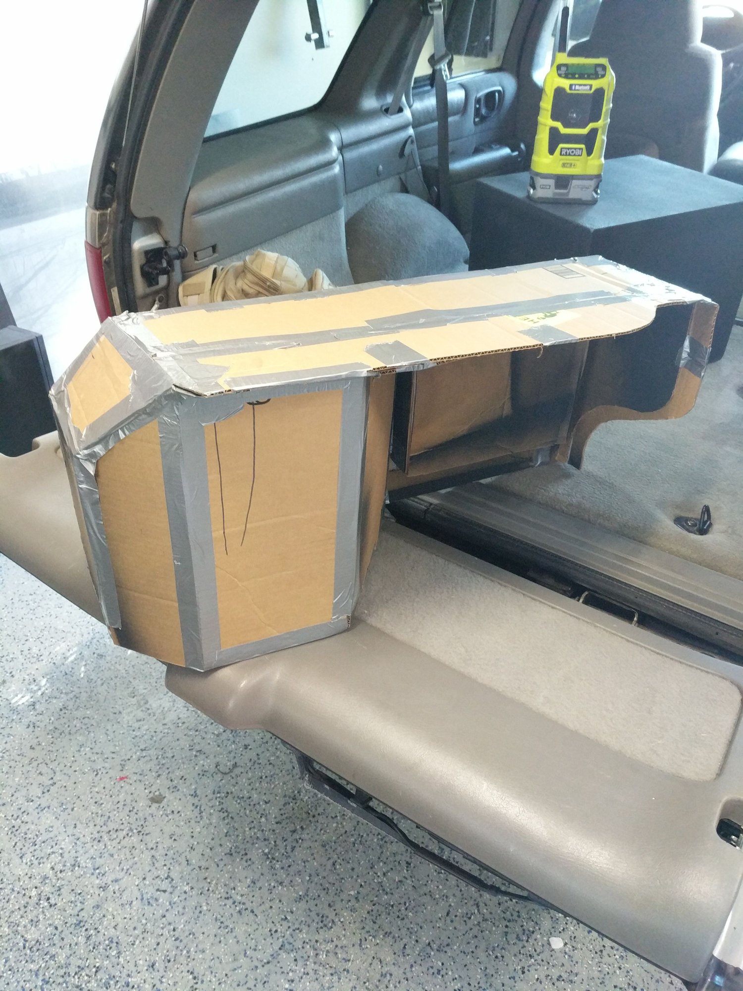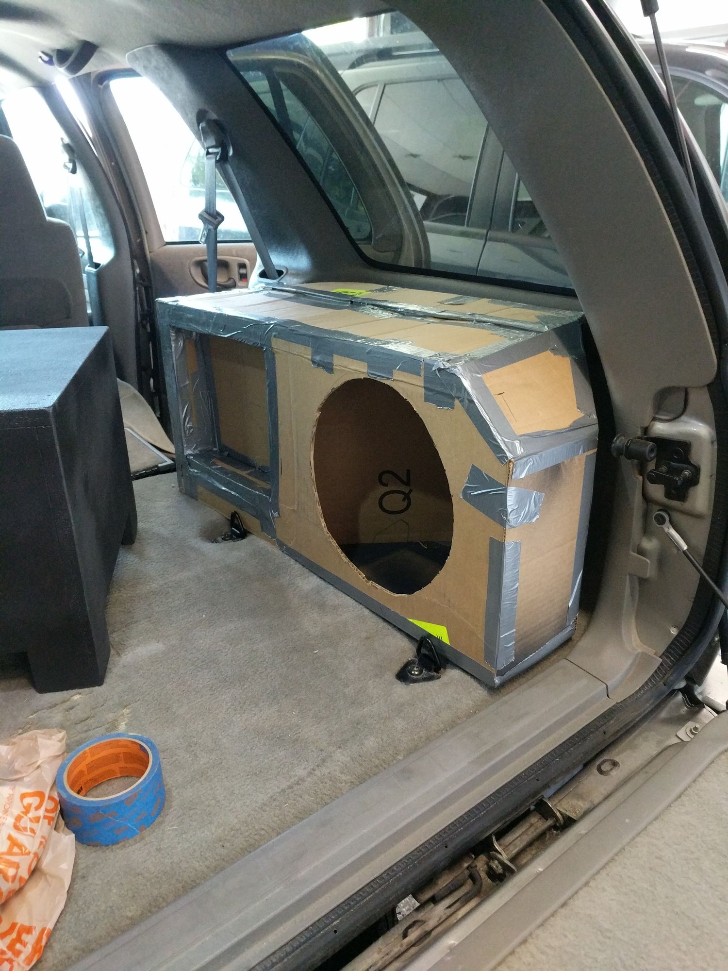 Hey guys there has been lots of great info on this forum, thank you all for that. I wanted to share my custom built Sub box project. I had originally just built a fairly standard down firing box but I didn't like how much room it took up. Then I decided to build one off to the side over the wheel well to take up less room. I started out by building a prototype box out of cardboard, since it made it easy to get it to fit right. Then I built the box out of mdf, sprayed it with bed liner and then painted to somewhat match the interior. I used the cargo hooks on the floor to secure the box and I made up some little brackets that fit in the slots on the right panel (meant for the cargo cover) to secure the top of the box. It turned out pretty decent. Check out the pics