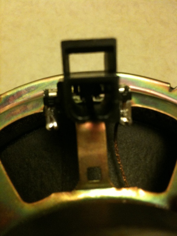 The back of the factory front speakers have a non-typical connector instead of a positive (+) and negative (-) terminal to connect lugs to.