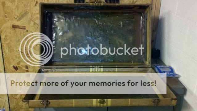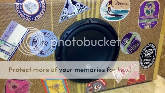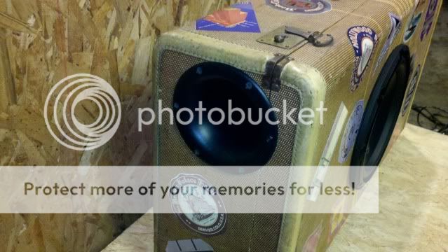 and here is the new enclosure. Its a 1940's suit case. Interior was fiber glassed, reinforced and sealed. 15" long 3" port ,final tune 35hz. Running a JL 10w3v3-4. Finished it off with the retro travel stickers. It will be held down on a bracket that it will slide on attached to the back of the seats. Lift to remove along with quick connect wires. No more then 30 seconds to remove.