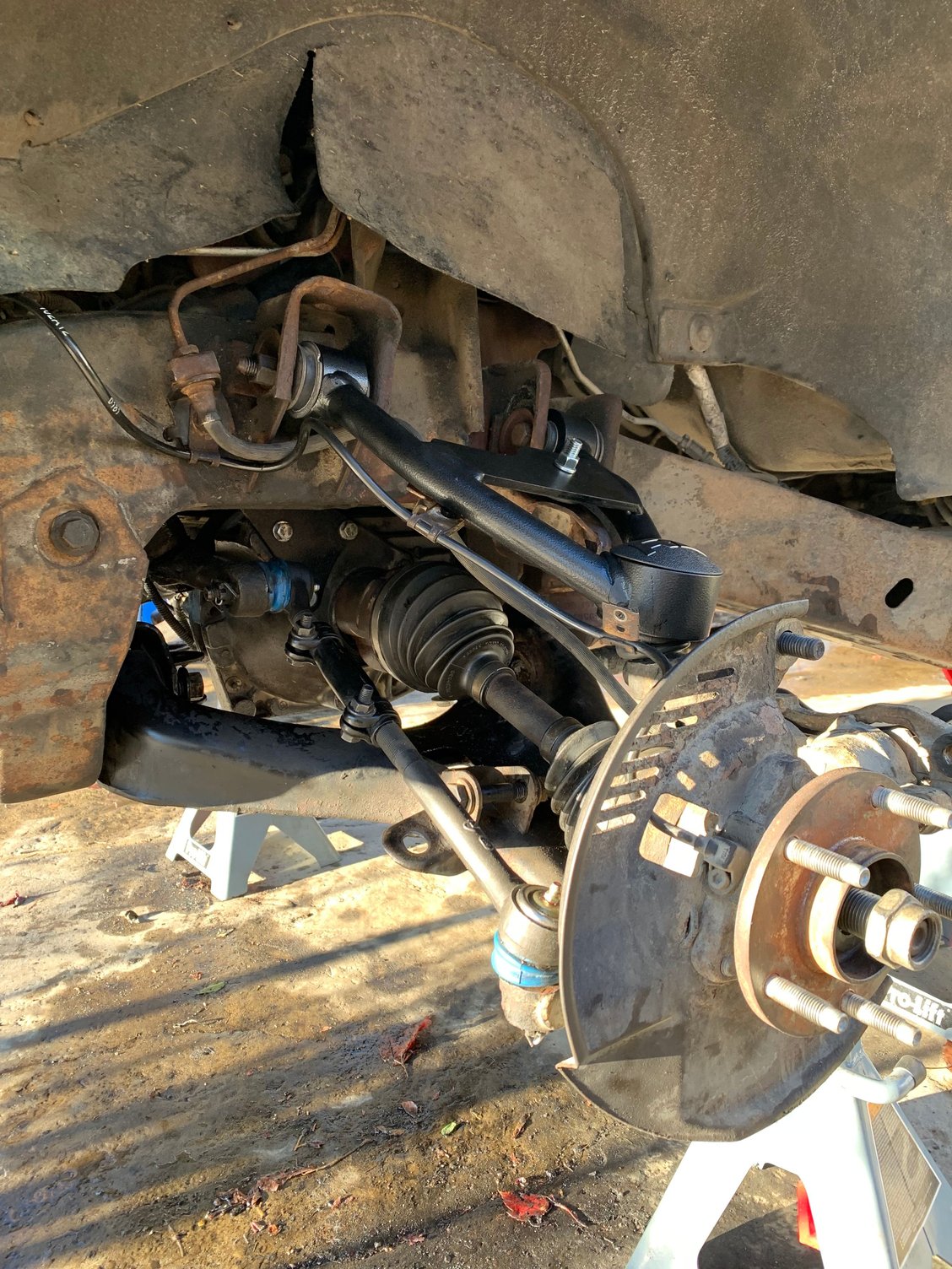 Yup, that would have been me too probably if it wasn't for you lol. I ended up dropping the diff again to make the cuts. I checked and it's really tight but seems to clear anyway I put the tie rod so I think I'm good now! Got the upper control arms in today and it's looking more like a truck again. Also got some 75w-90 to top off the front diff tomorrow, I haven't checked the level but I am quite sure it will need a top off. The new passenger tie rod will sadly have to wait because the threads in one side of the new sleeve were all messed up and it royally messed up the threads on both tie rod ends when I tried screwing them in that end. So the old one goes back on for a week or so until the new one arrives. Going to feel much better after the torsion bars are back in, you see I got the torsion bar loading/unloading tool and assumed I would have the socket to tighten it up, well come to find out it's a big 1" socket and I don't have one!