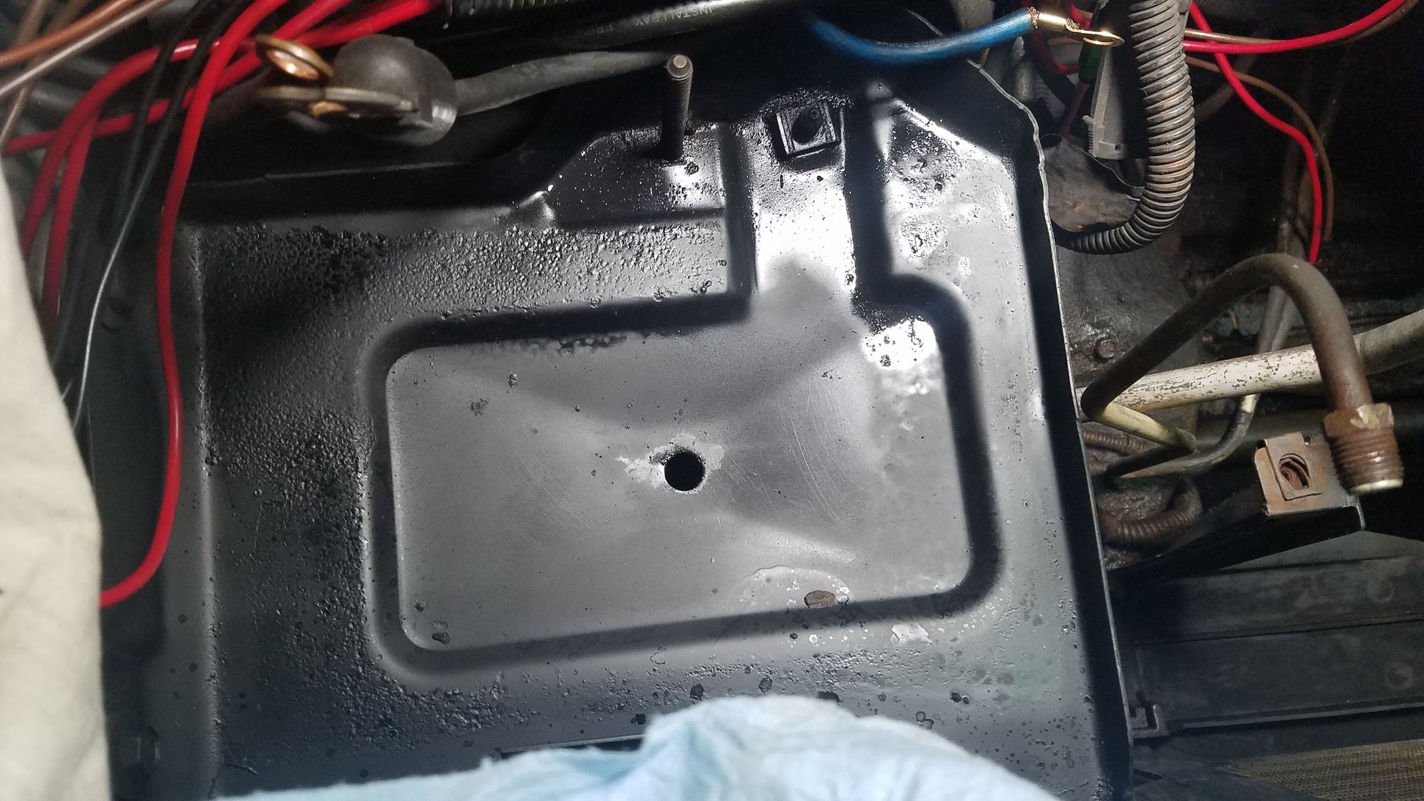 While I had things apart I cleaned up a little, and hit the bottom of the battery box with a coat of rust reformer. Fixed a few fins on the condenser as best I could.