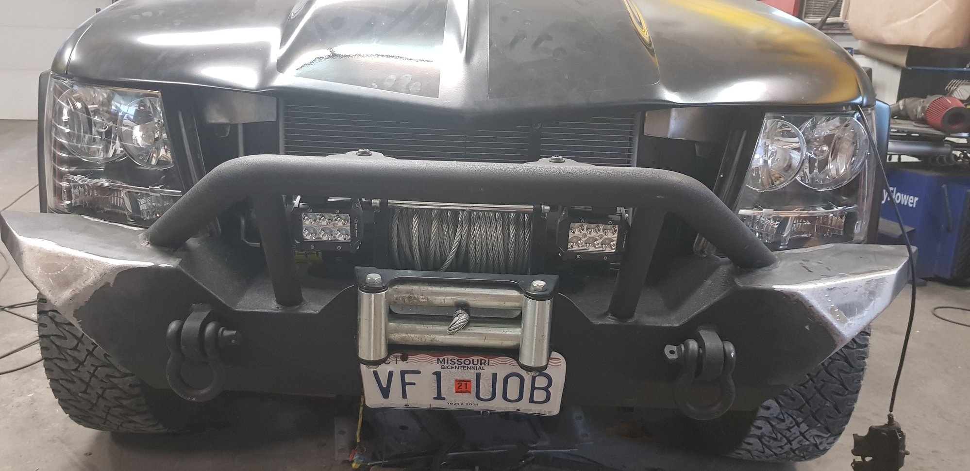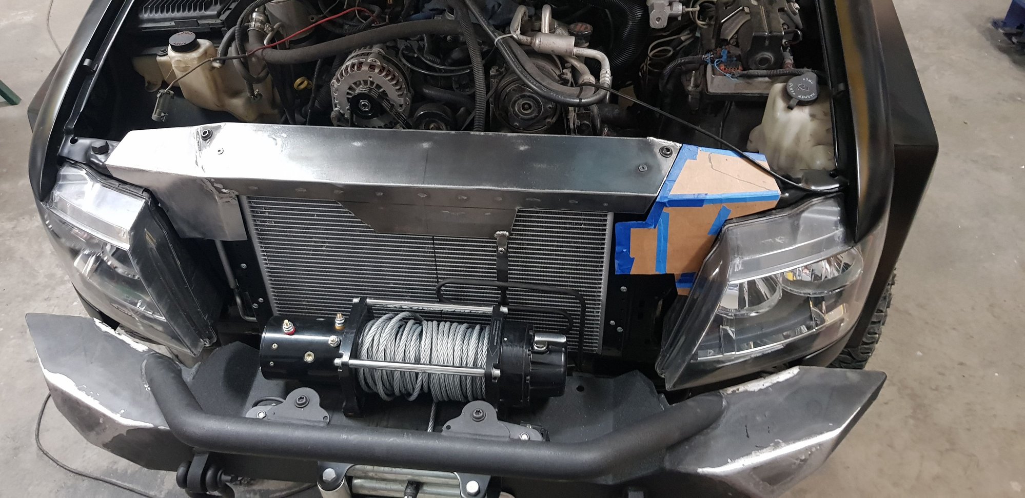 shaved the front bumper, moved the winch behind the grill, passenger side radiator header completed.