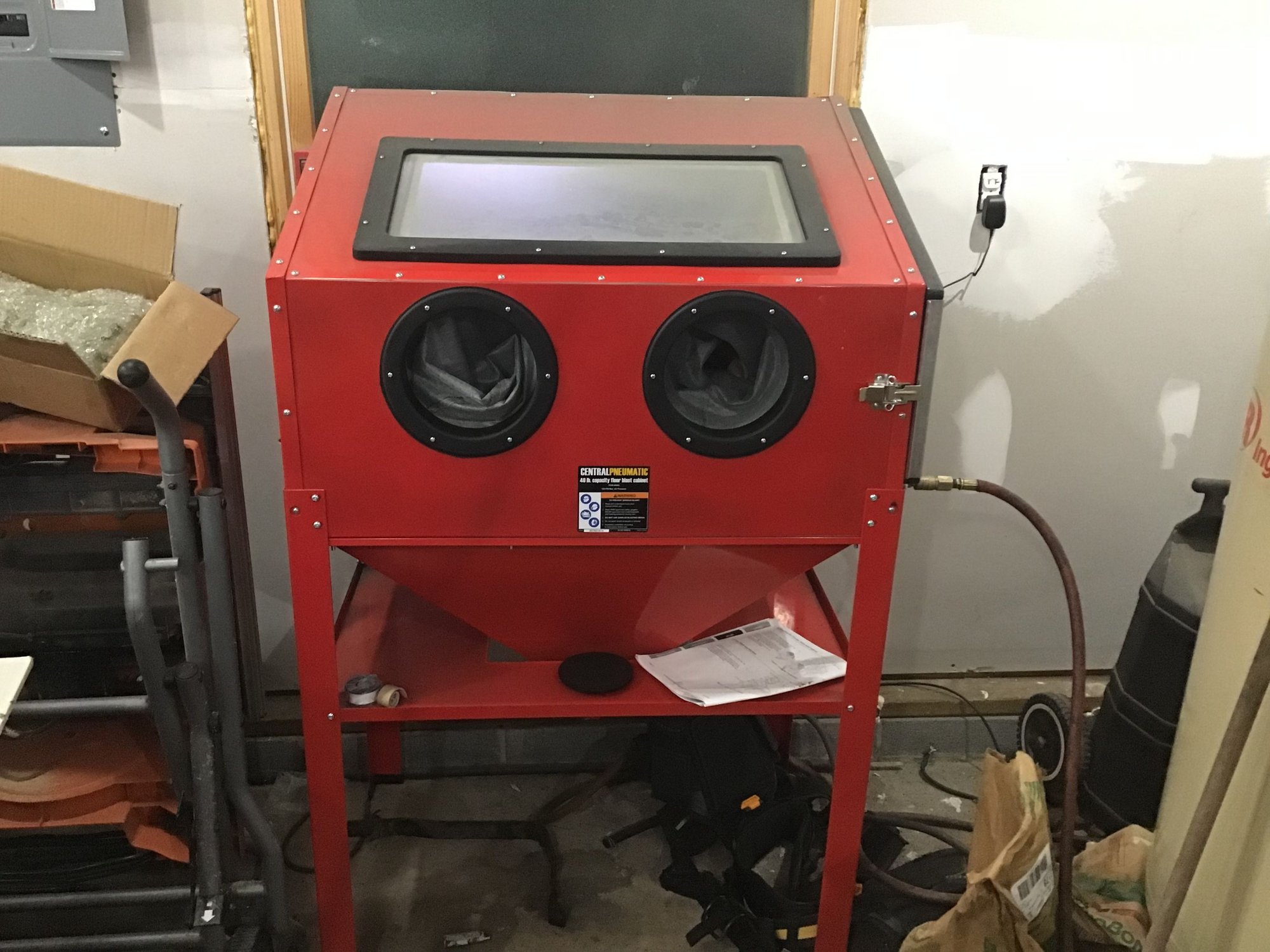 Been a little busy so I haven’t done lots. Spent 2 nights assembling a sandblast cabinet from Harbor freight. Blast gun sucks . Using the biggest blast nozzle it still jambs with medium grit black beauty. So tonight I finally blasted the front diff assembly.