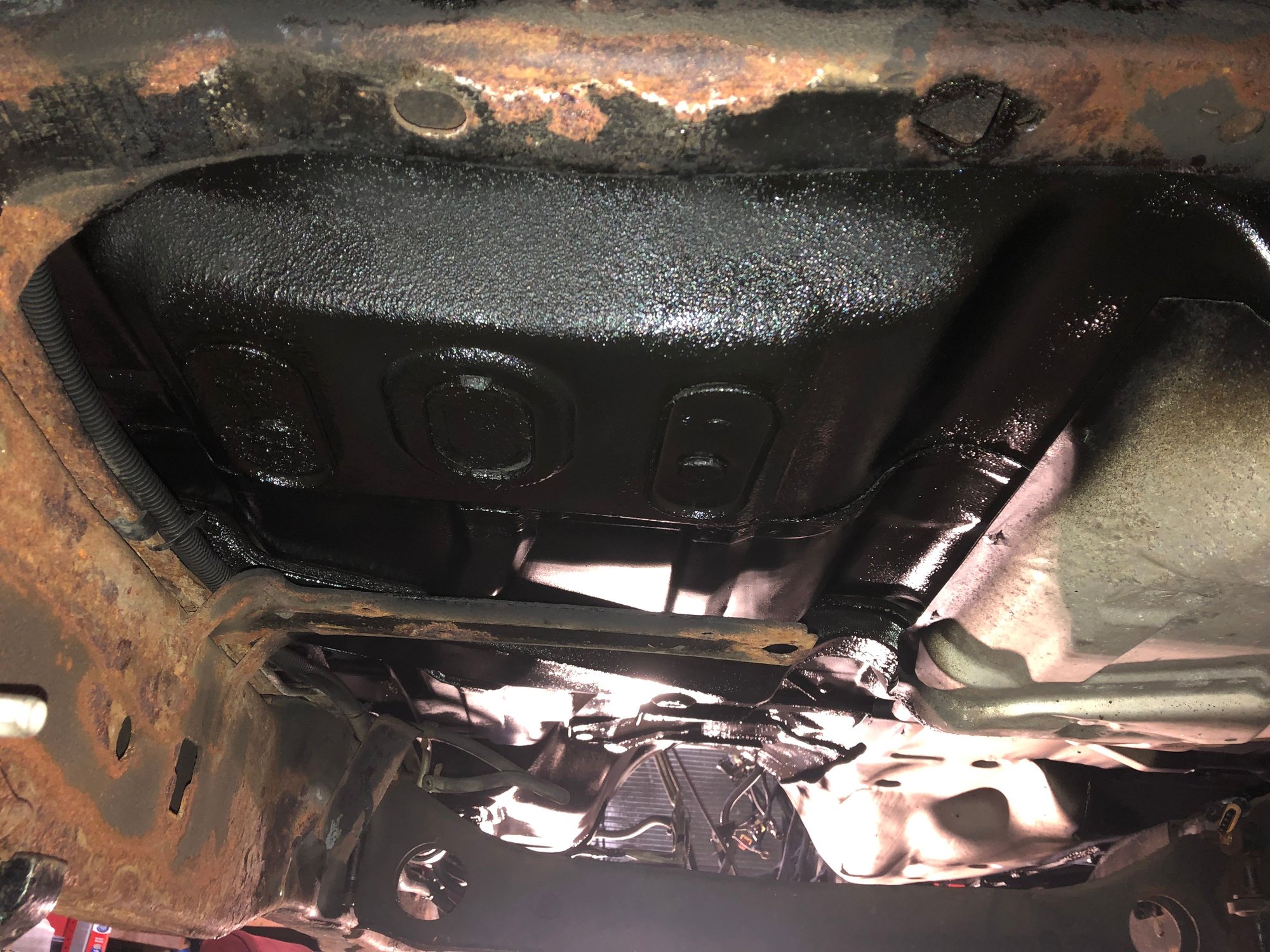Applied second application of undercoating . I used the Rust Olean rubberized. Have one section I think I’m going to have to wire brush down and clean off. Tried to paint over after an hour of cure time as a test. That’s a negative using ExooRust paint.