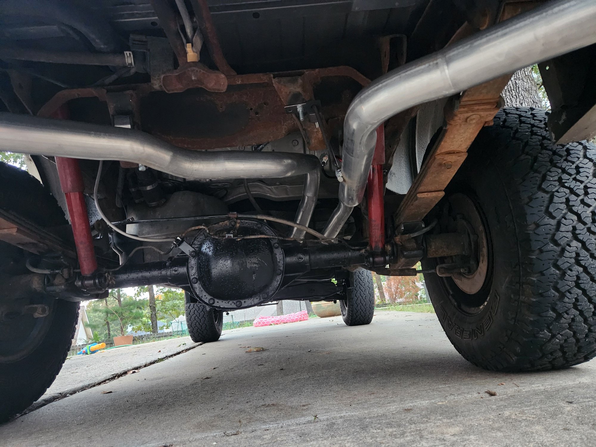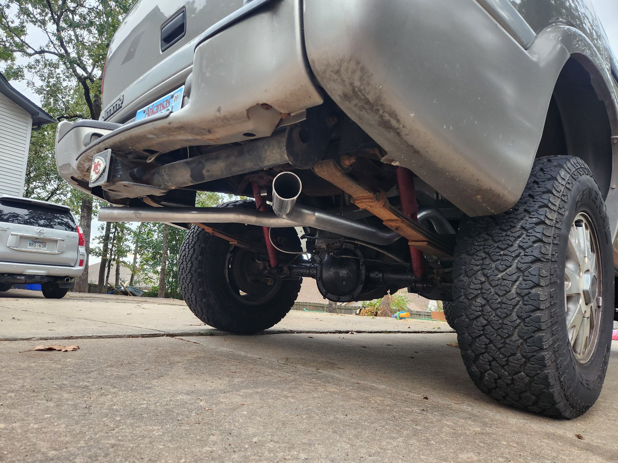 Thanks for the kind words. We got it in to the muffler shop. I don't mind doing most things, but I let the shop do the exhaust. They put a permanent bend under the lowered front drive shaft, replaced the cat with a high flow factory replacement, replaced the muffler with a flowmaster 40 with dual outs, then added two pipes out the back corners. The gas tank breather box on the drivers side makes it a tight fit, so we removed the spare ran the pipes inside of the rear leafs. We're putting on the spare tire carrier anyways. The old cat was empty, and the old muffler was full of all kinds of crap. It sounds great and runs smooth. Now he's looking for some tips for it.