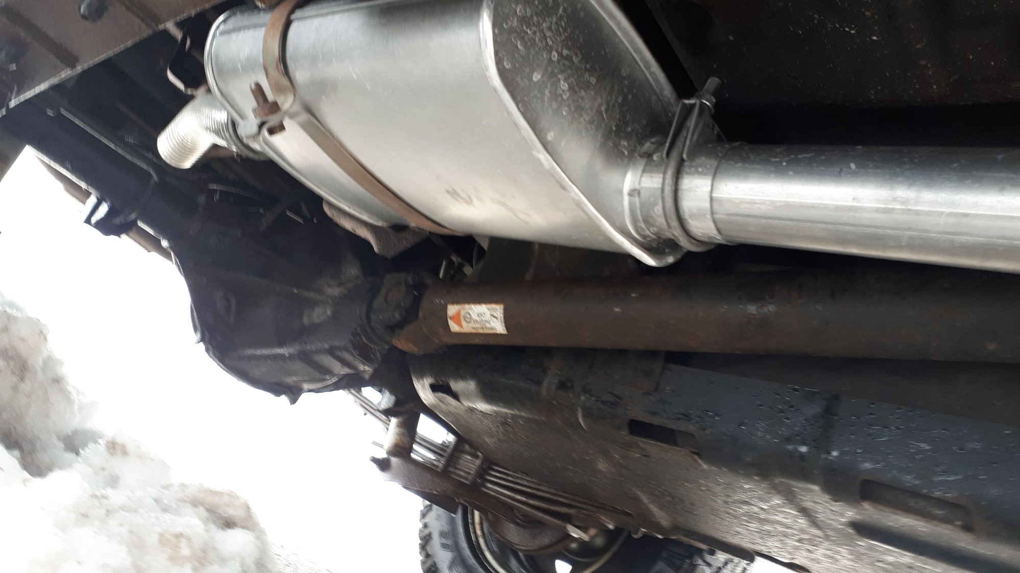 Did my bandaid muffler repair. Its doesnt sound like a German tank anymore lol. Pulled this year and a half old pos... Modified stock muffler bracket to fit my 55$ muffler... All installed... Flex pipe to come over the axle...