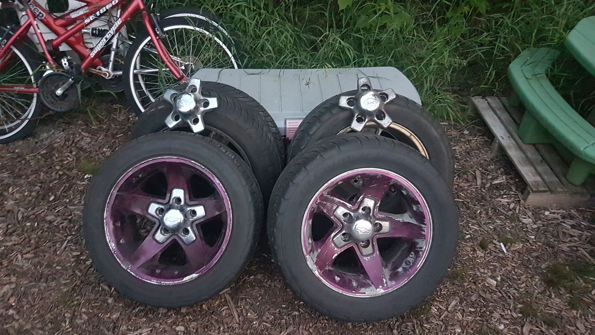 So I got the rims, theres one rim which looks like they took a grinder to cut a bolt off. But they got nice rubber on them, 225/50r16 fronts and 245/50r16 rears, even wear. They will clean up nice, with come paint will be nice. Came with all 4 CHEVY caps. Unfortunately only 5 plastic lug covers, and no nuts... I got the nuts. And a few covers. I'll stop by the yard and pic up the rest. I come across enough of them.