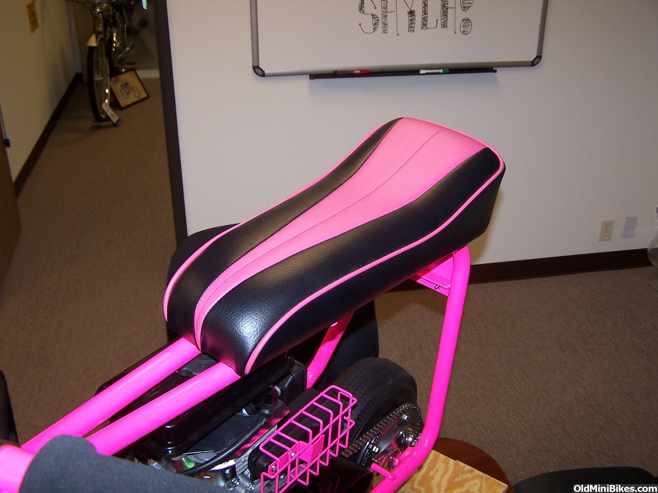 I now have some progress, though. I'm getting the seat made. I went to Jo-Ann Fabrics and got some vinyl for the seat. I also got some foam and a new piece of wood to make the seat. I got the wood cut and shaped the way I want it, and the vinyl is stitched together. It's going to look a lot like this, but all black.