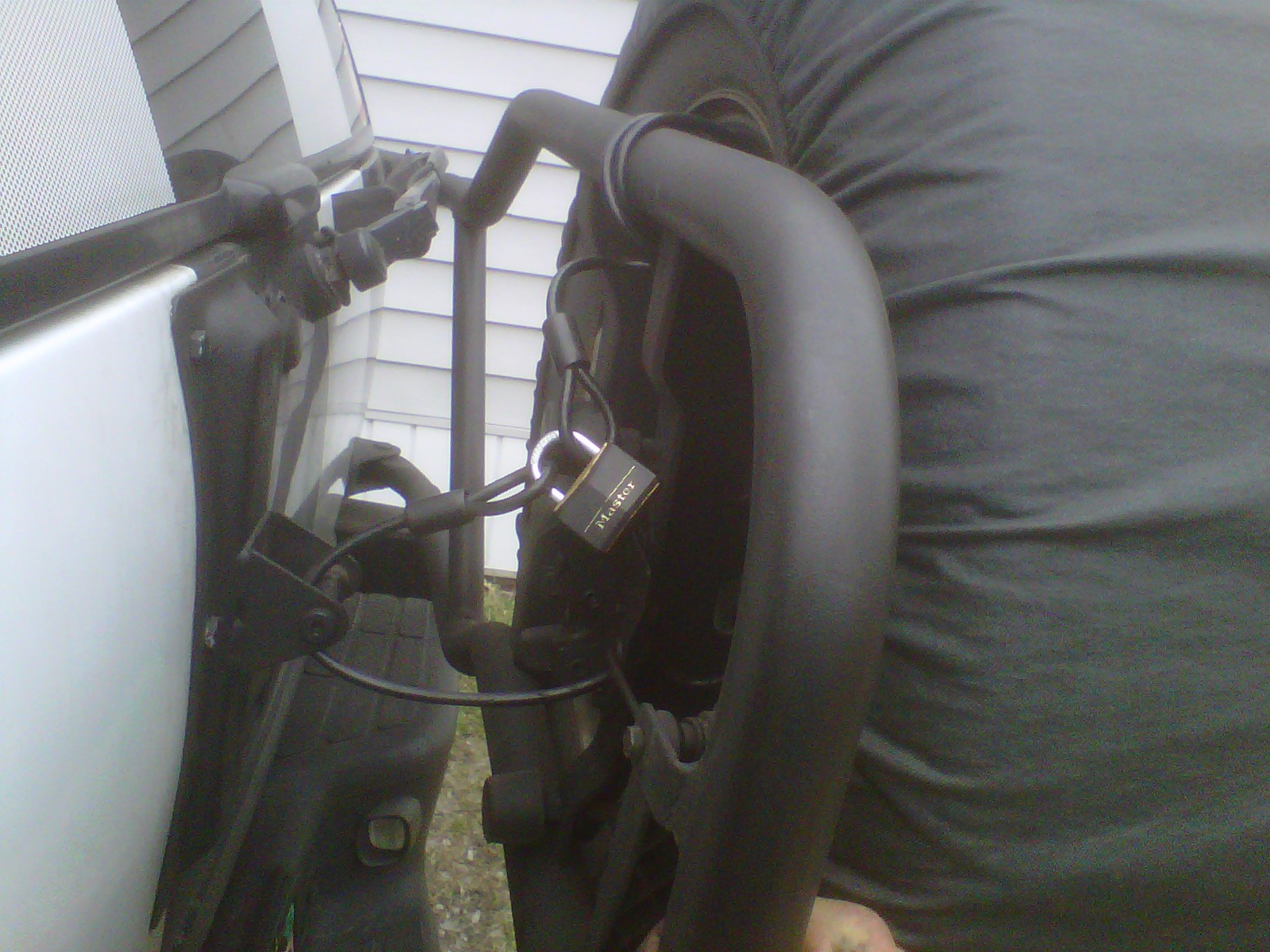 I knew someone put a cable on theirs, but I couldn't remember who. Got a picture? I don't really care about locking mine, but I was thinking along the lines of a small cable and hairpin clip like you use for hood pins.