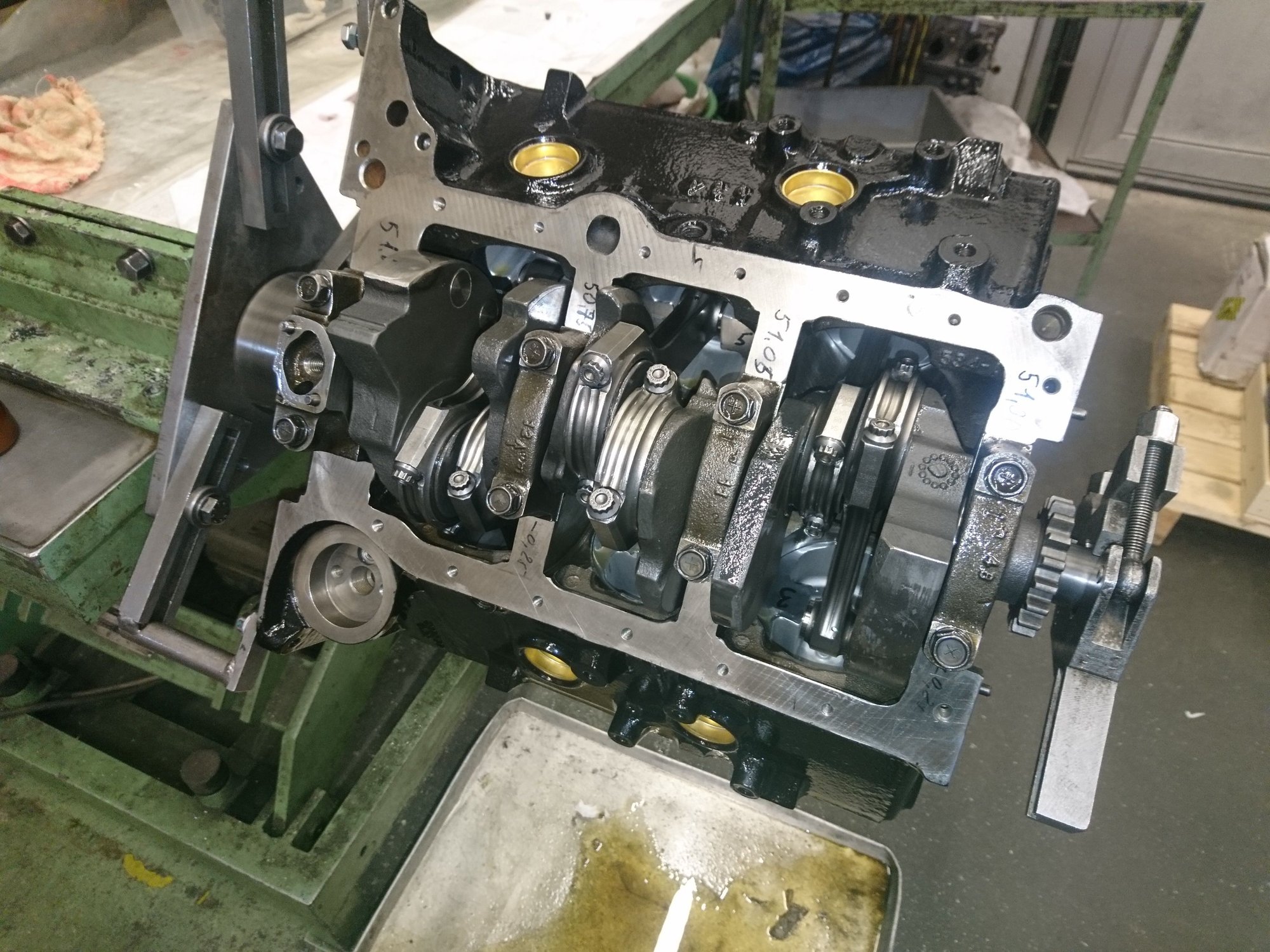 Block on the stand. Parts layout to check if all is complete. Quickly put the heads on to check the ARP bolts. New bolts are shortly longer than OEM. Don't want surprises later on.