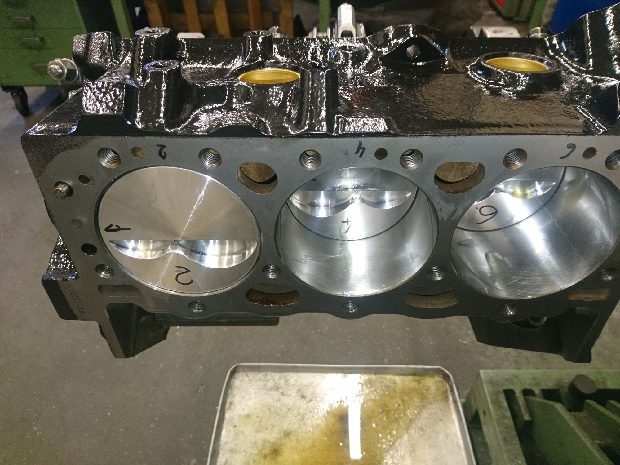 Balancing error will be 0.6 % and if we cut down the lower piston skirt the error will be 0.4%. That means instead of accounting for 50% of the alternating masses (pistons, pins, locks, rings and small end of rod) I will have a 49.6% balancing job. This will in no way affect the overall balancing. Depending on the engine builder we have seen figures from 40 to 70 % for the alternating masses. When cutting the skirts we'll at the same time weight match the pistons to 0.5 grams.