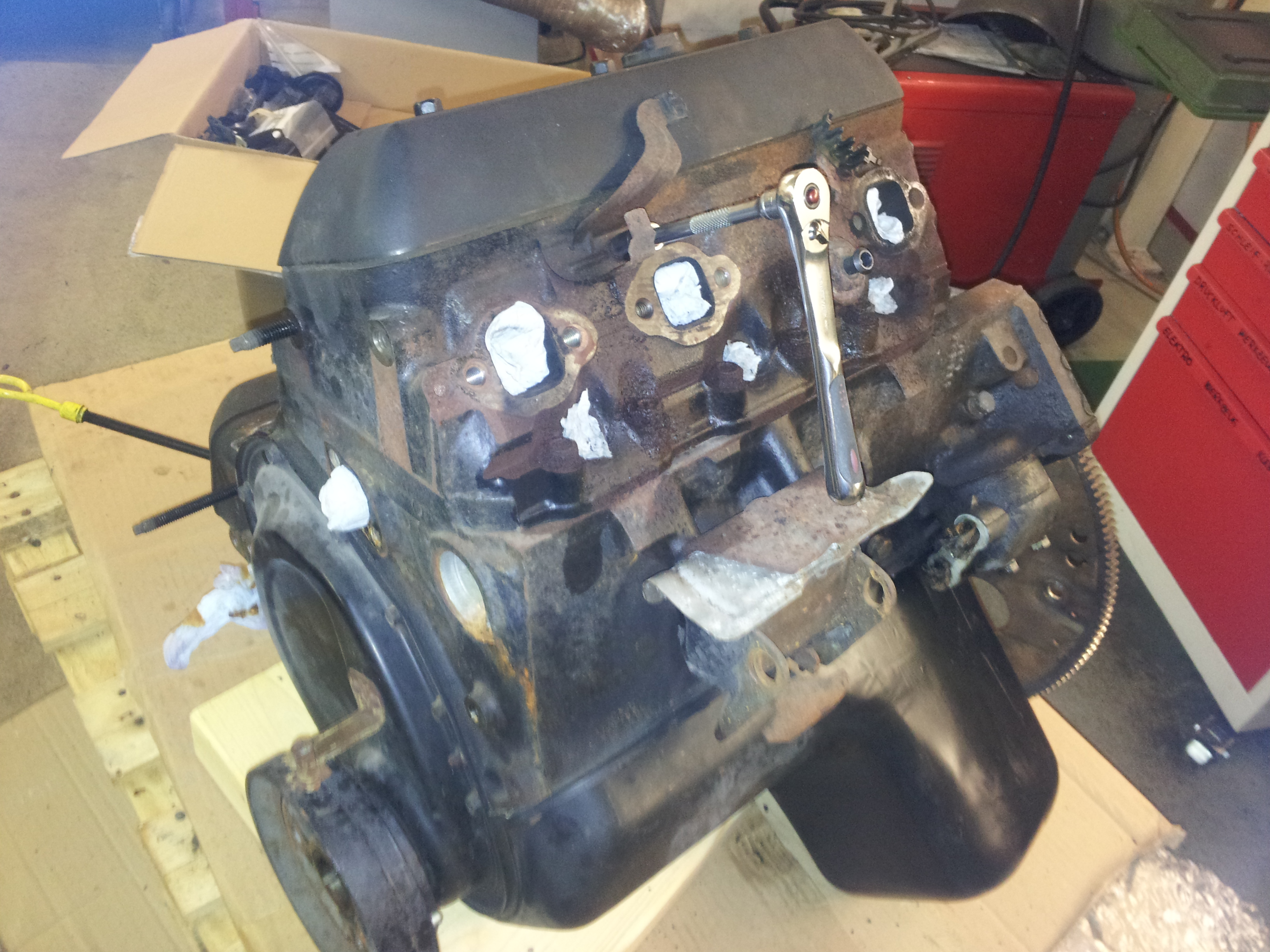 Heads are off, all stuff around is off and the oil pan is gone. Next step will be rotating assembly and pistons.