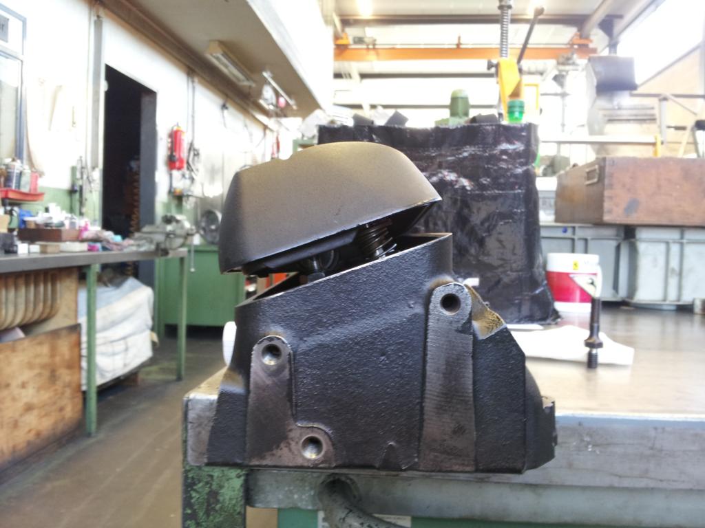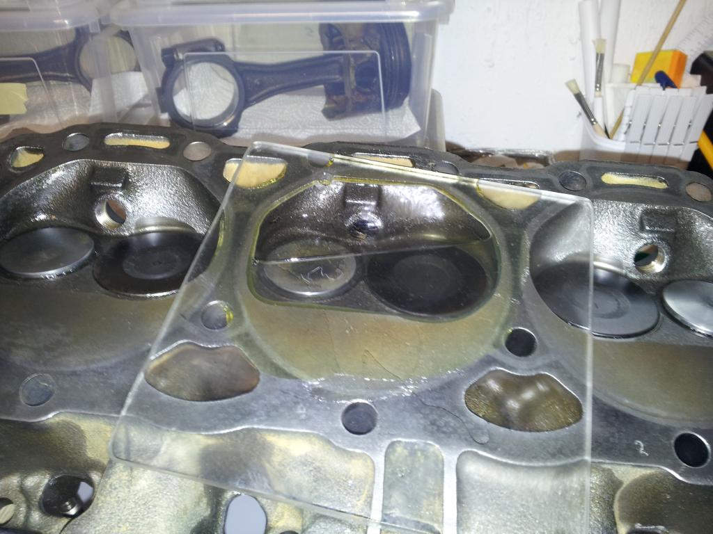 Some pics, from what they looked when coming off the engine, after hot tanking and deburring. CC'ing the chambers had the surprise that they were within 0.3 cc's of each other. The highest number was 65.2 cc's which will most probably go up to 66 cc's because of the work on smoothing out the chambers. Cutting the heads will most probably remove 1 cc so my calculations are based on a 66 cc chamber. Even with a pessimistic assumption it will put compression to 10,8:1 as the lowest value.