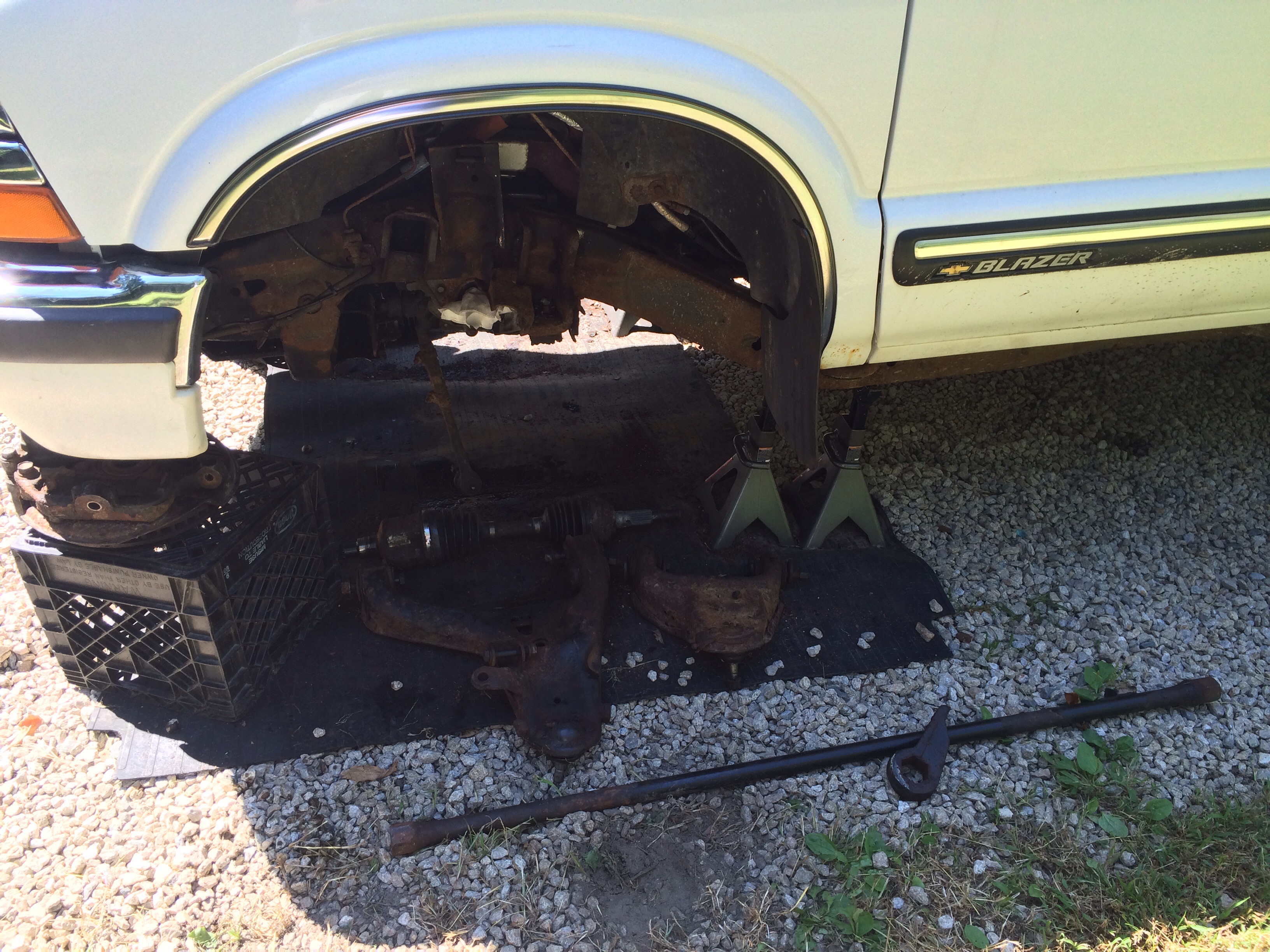 I finally decided to start working on the suspension lift yesterday. I got the upper control arms disconnected, shocks out, torsion bars unloaded. I see this taking a week or more as it's not a daily driver and I'm in no rush to get it done.