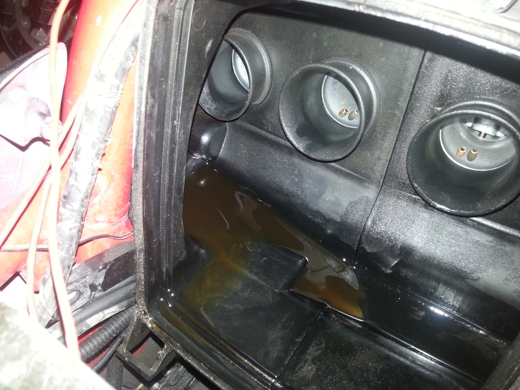 The water looks brown in the pic, but was really green IRL. It also smelled strongly of gas and had an oily feel. So I cleaned it out, and will check it again in about a week to see if any gas is finding it's way into the box, or if it was just water.