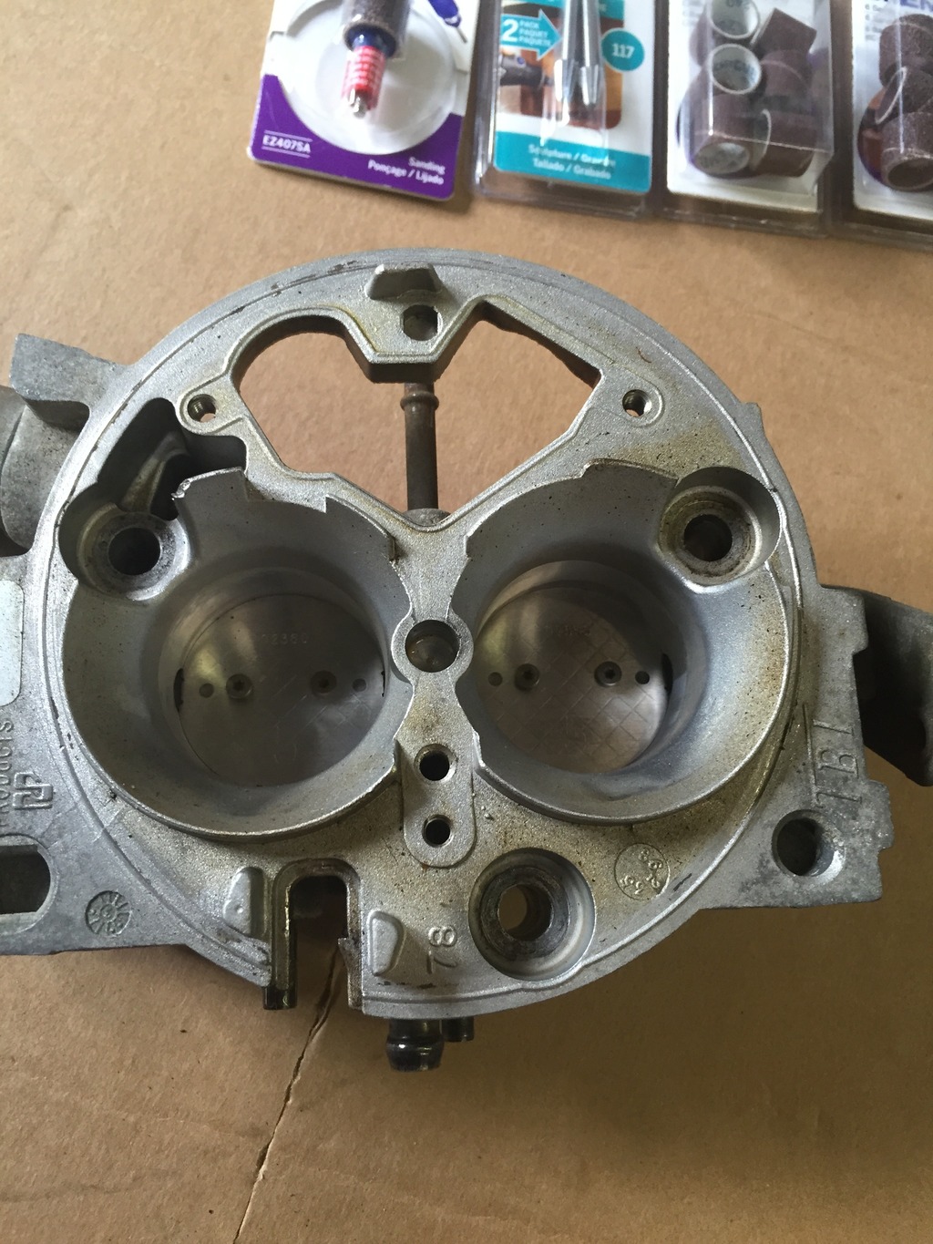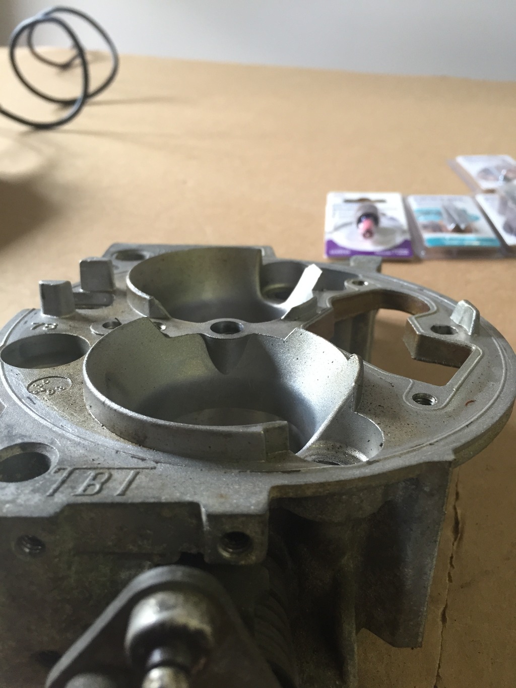 I've been doing a lot of reading regarding the TBI and upgrades for it so I figured it was time to start with a couple of them. I started with removing the ridges around the bores and opening them up a bit. I will also order a injector pod riser and TBI spacer in a day or two but for now heres some pics!
