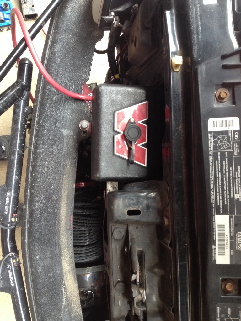 I still have to do the wiring but I need to order some terminals cause I am gong to have to extend all of my wires. On with the pics!Its an ORD mount I am happy with it for what I paid I will probably modify and raise it when the time comes to build a bumper since I feel like I have lost alot of approach angle with it on there.